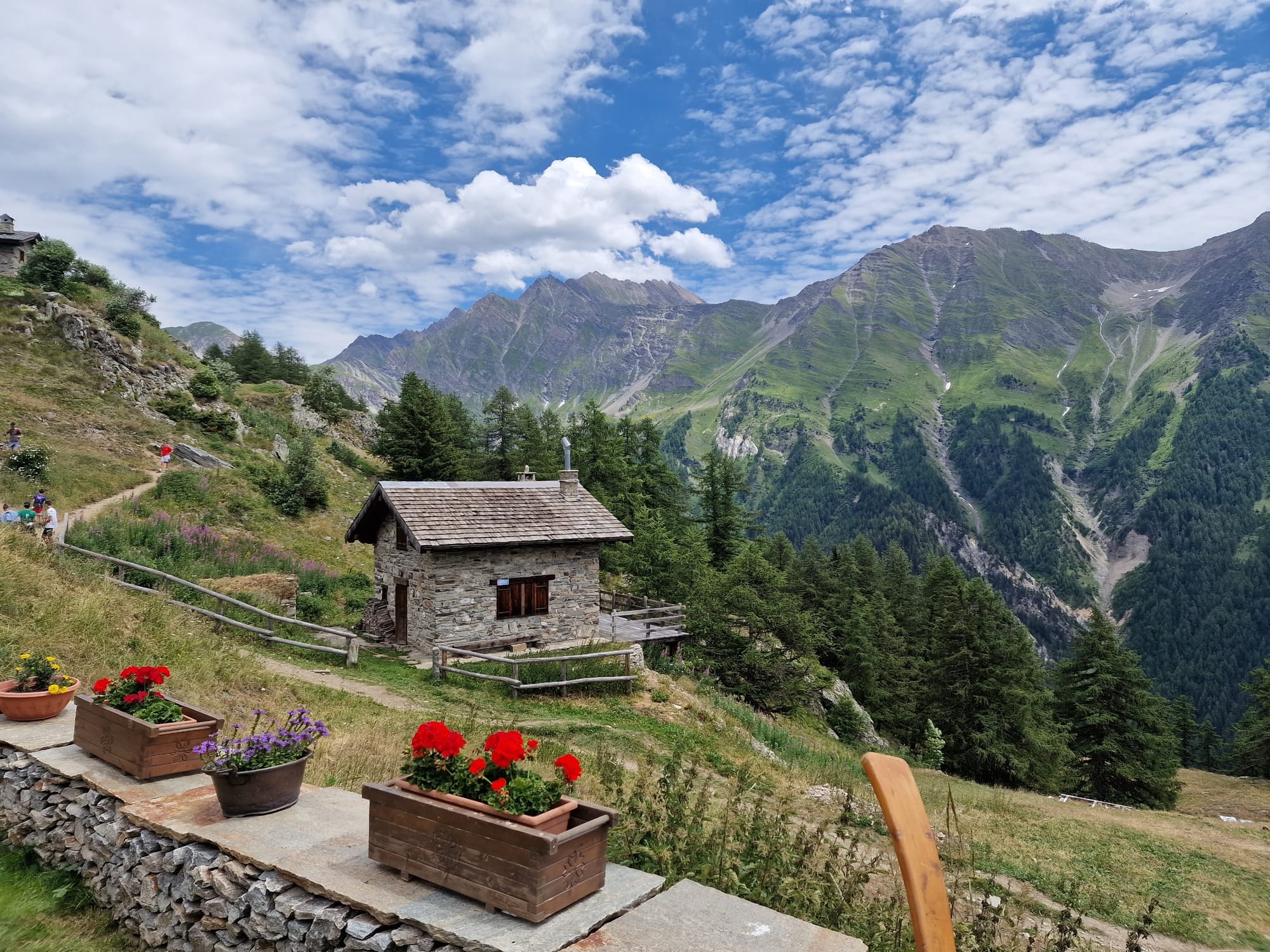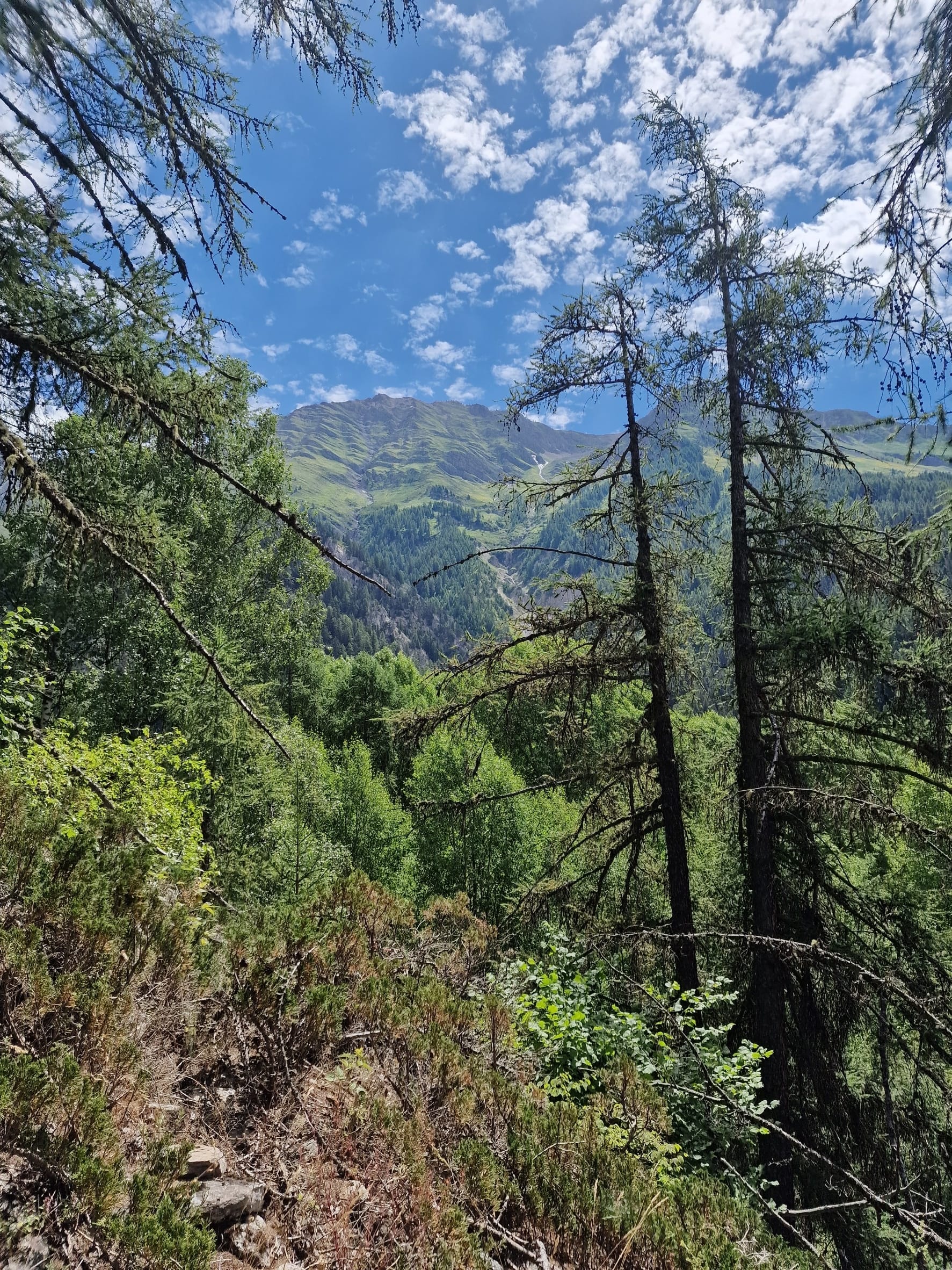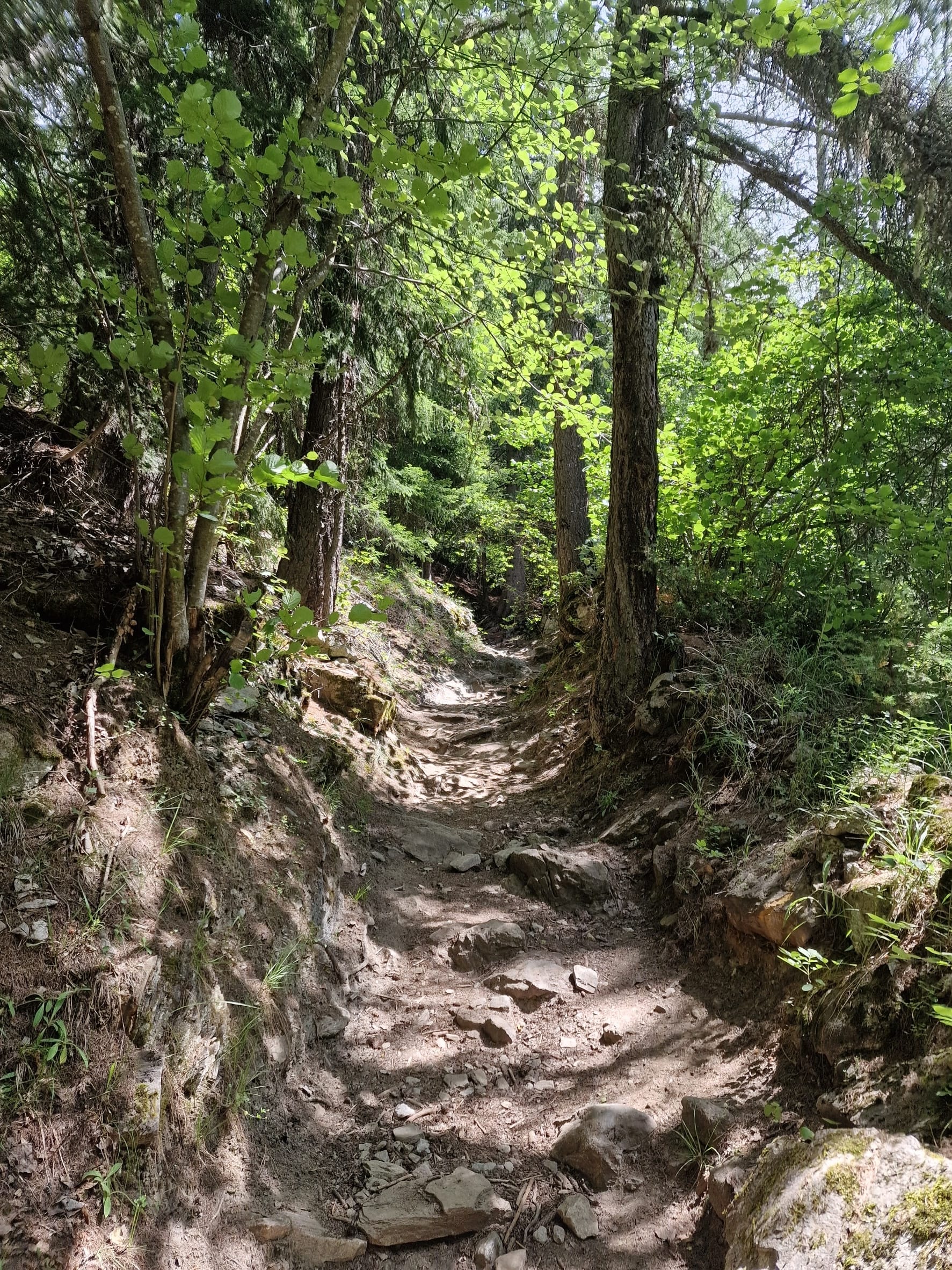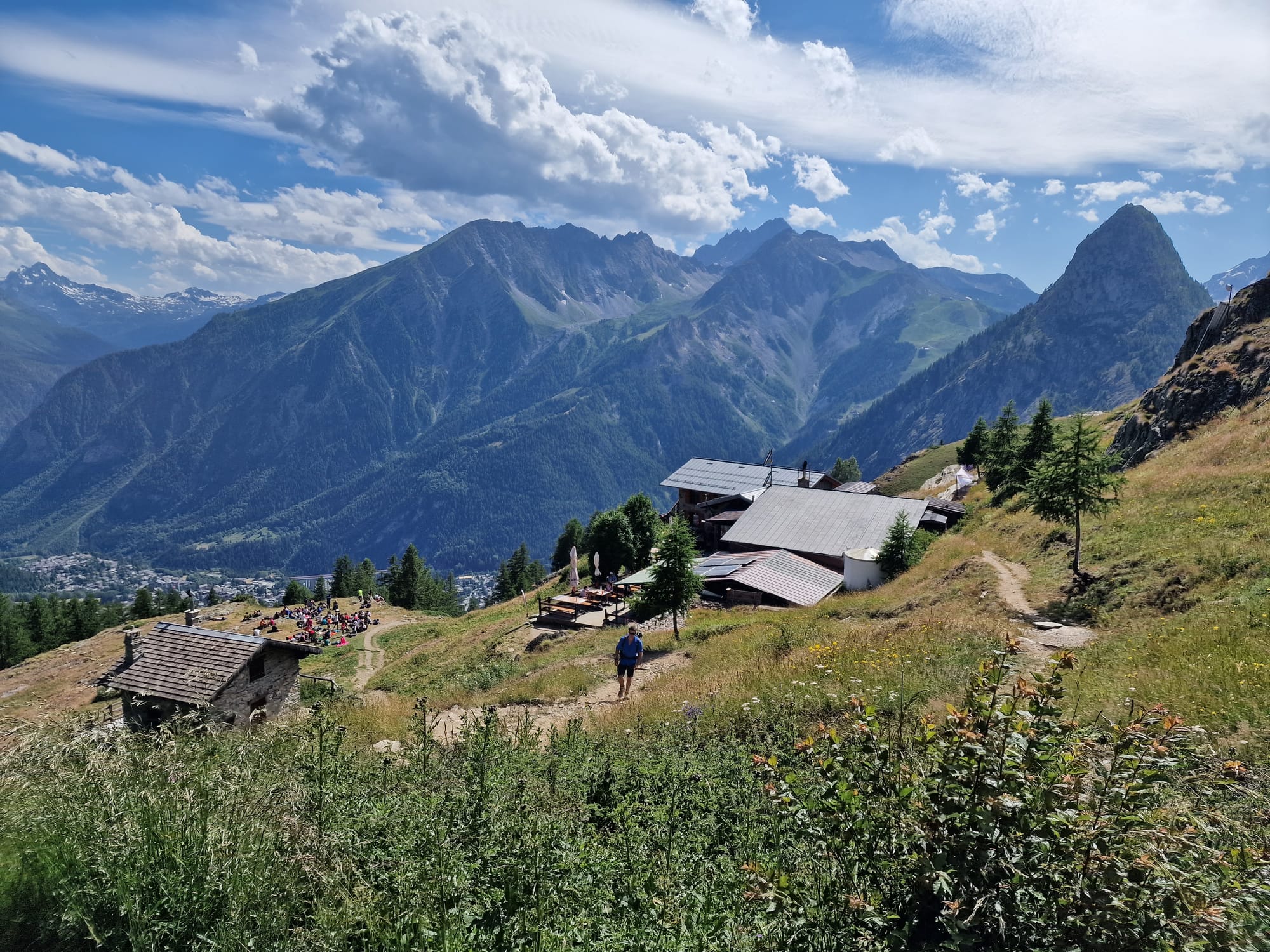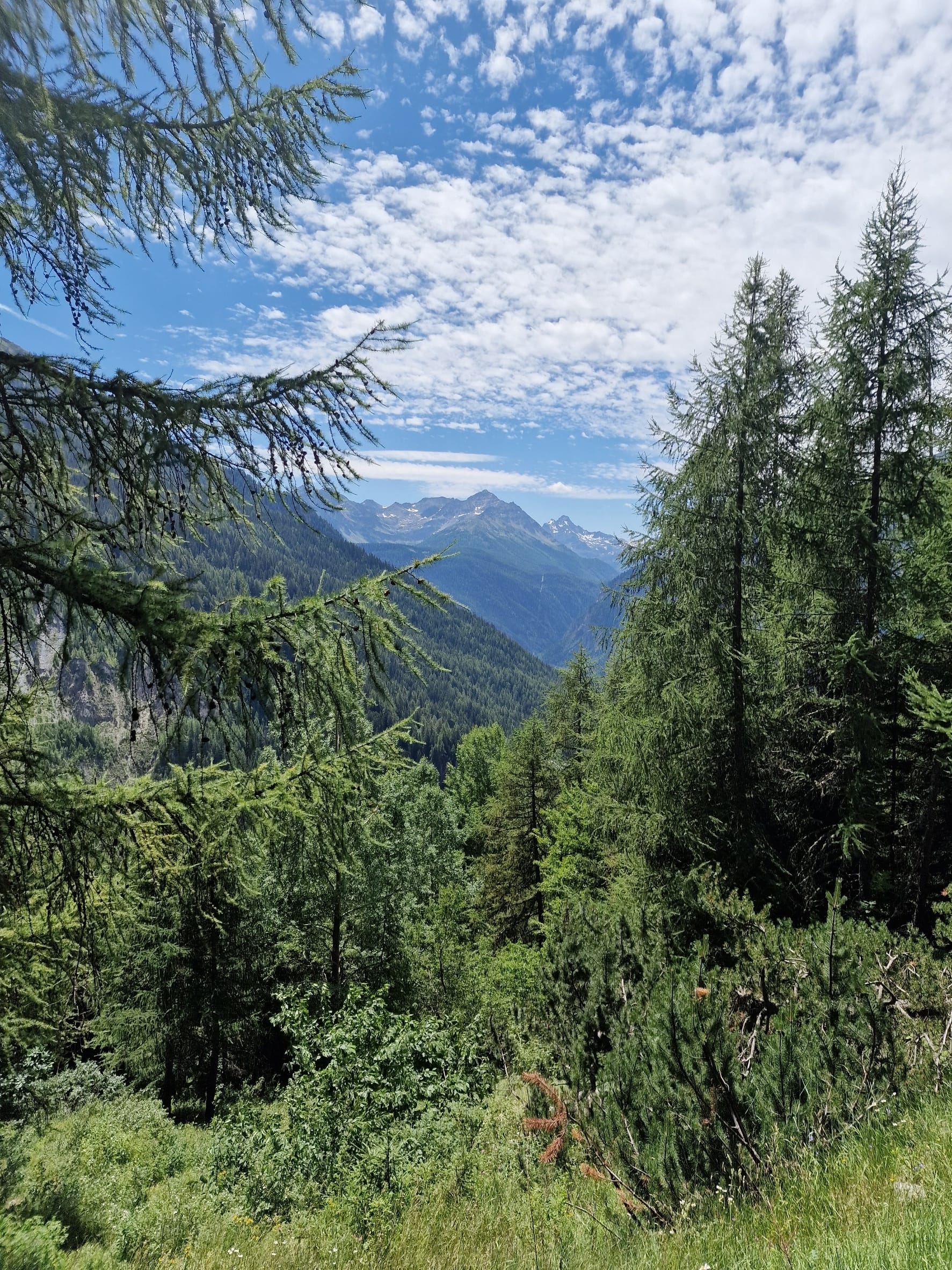 Von Courmayeur ging es auch gleich, zunächst gemächlich, aber schnell steiler bergauf, unserem heutigen Ziel, dem Refugio Bertone entgegen. Wir liefen zunächst durch das wunderschöne italienische Örtchen, um wenig später in einem zauberhaften Wald auf einem schmalen Pfad nach oben zu wandern.