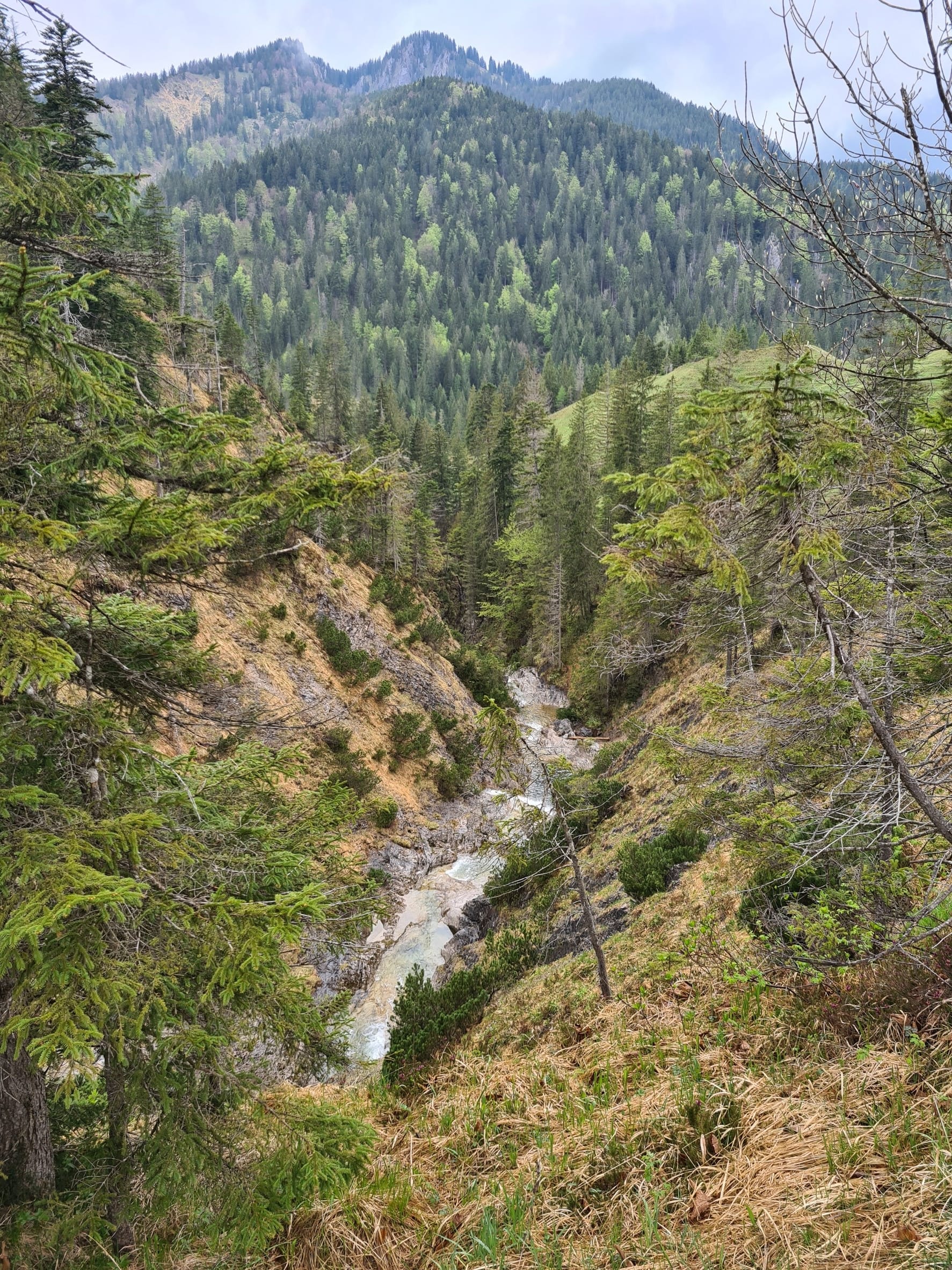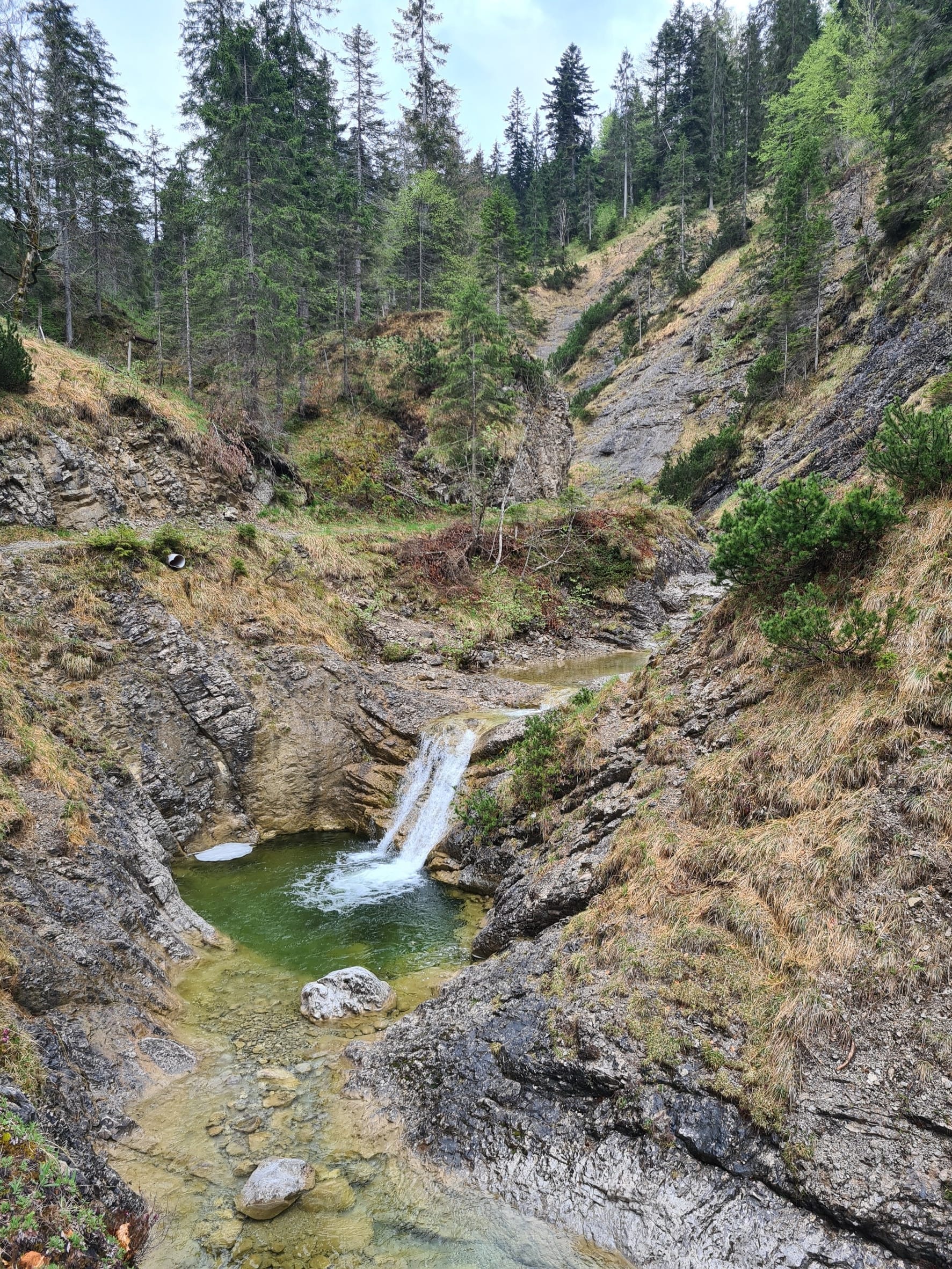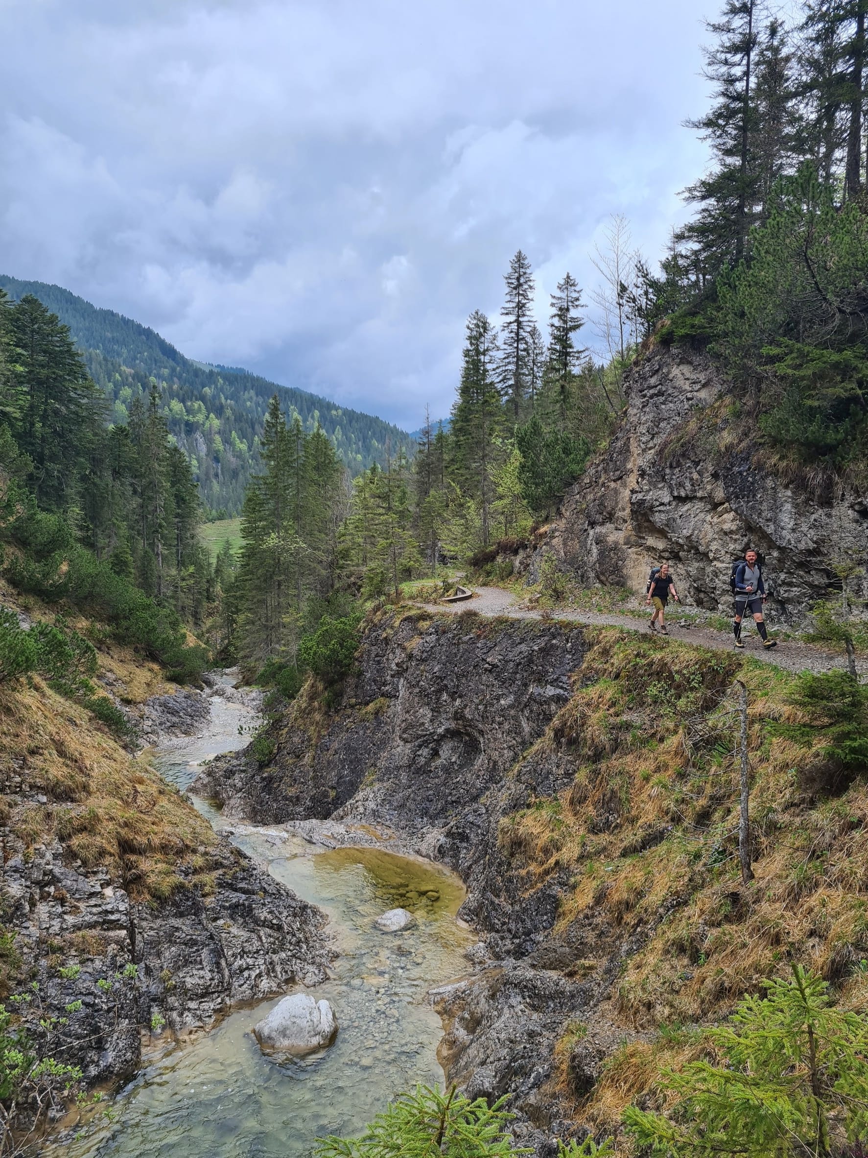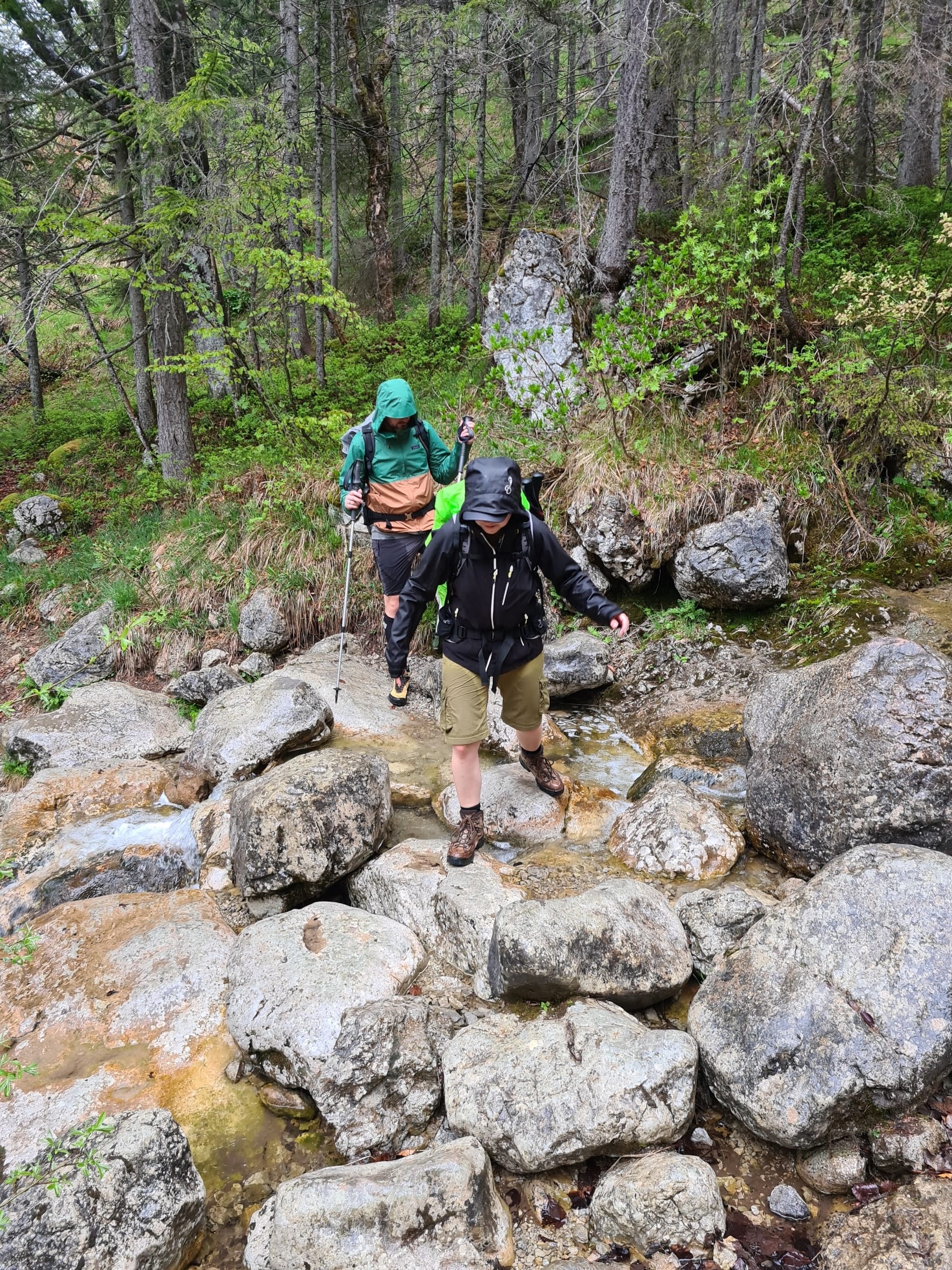 Zunächst noch im Trockenen ging es entlang einer herrlichen Klamm, dem Pfandlgraben, in der das Wasser eines Baches über mehrere sogenannte Gumpen ins Tal stürzt. Und schon bald schon kam das Wasser auch von oben.