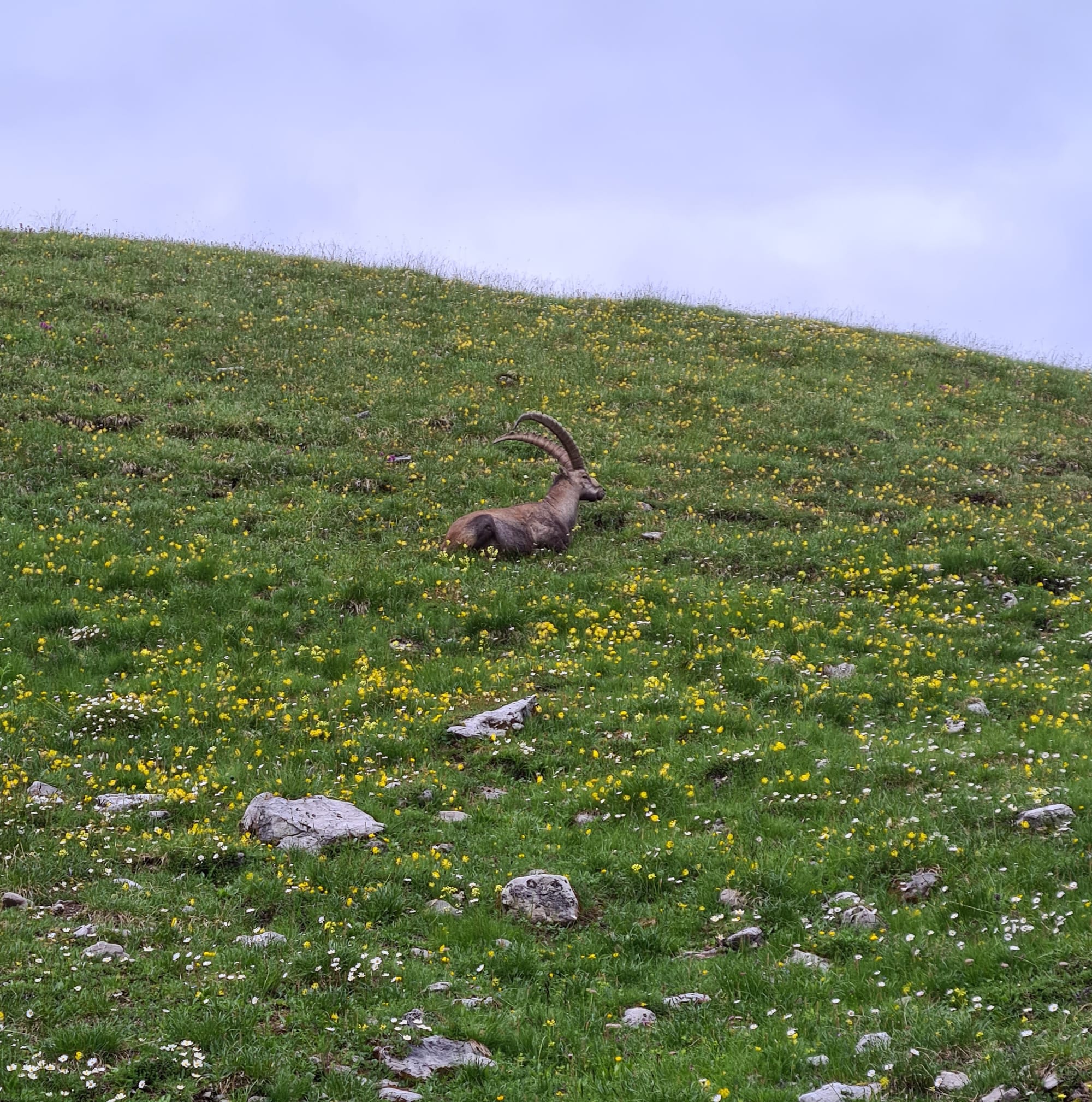 Am Abend sahen wir noch Steinböcke, die sich, in einer großen Herde, direkt nahe der Hütte am Hang befanden und deren Jungtiere im steilen Gelände herumtollten, als gäbe es keine Schwerkraft.