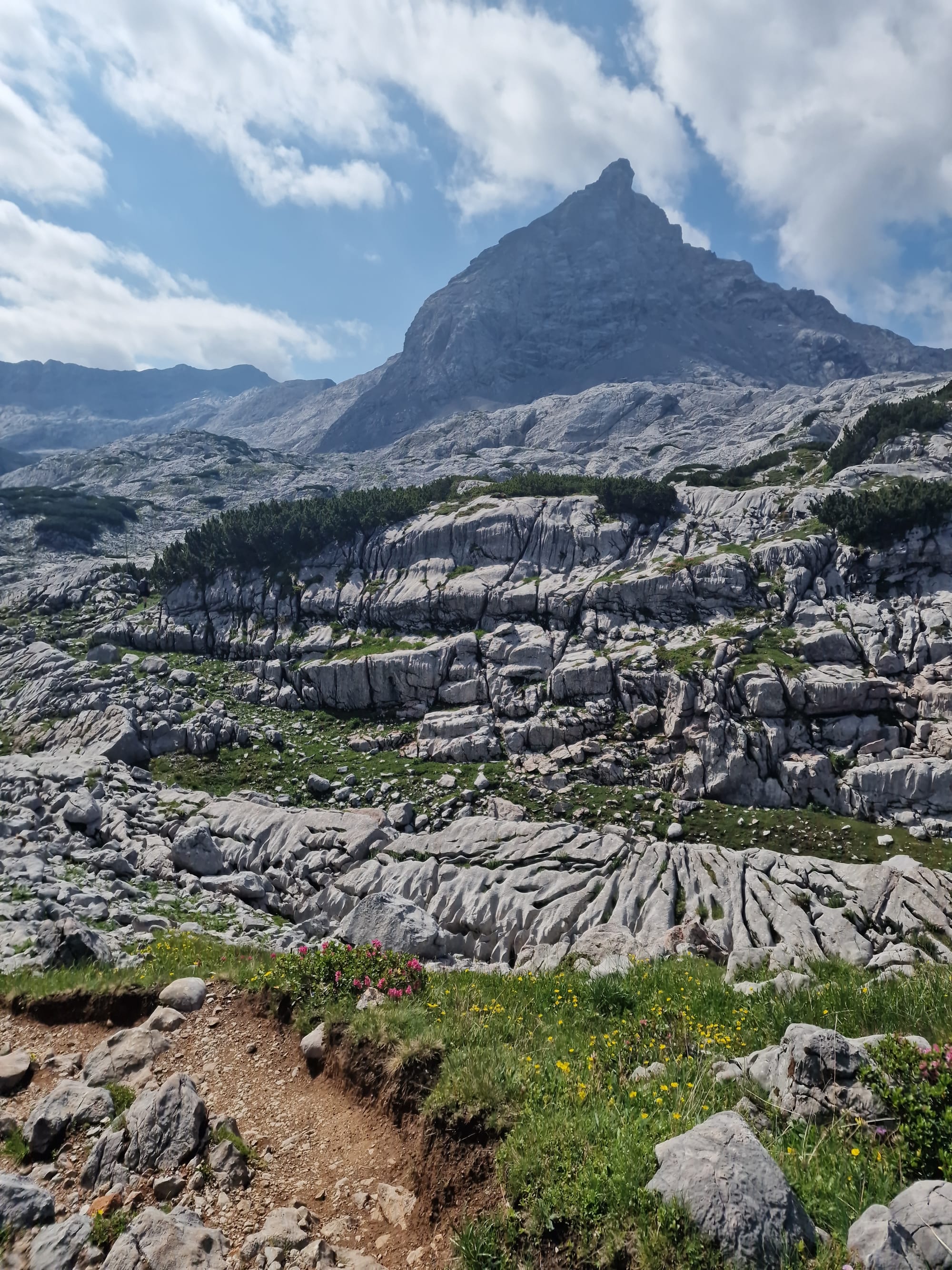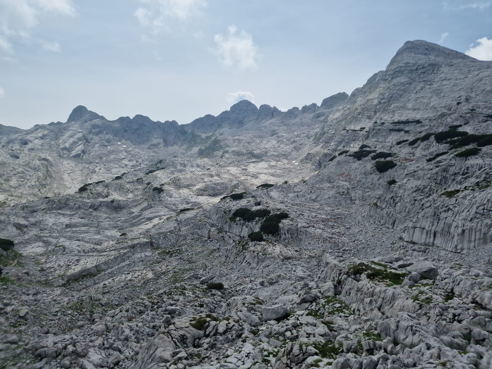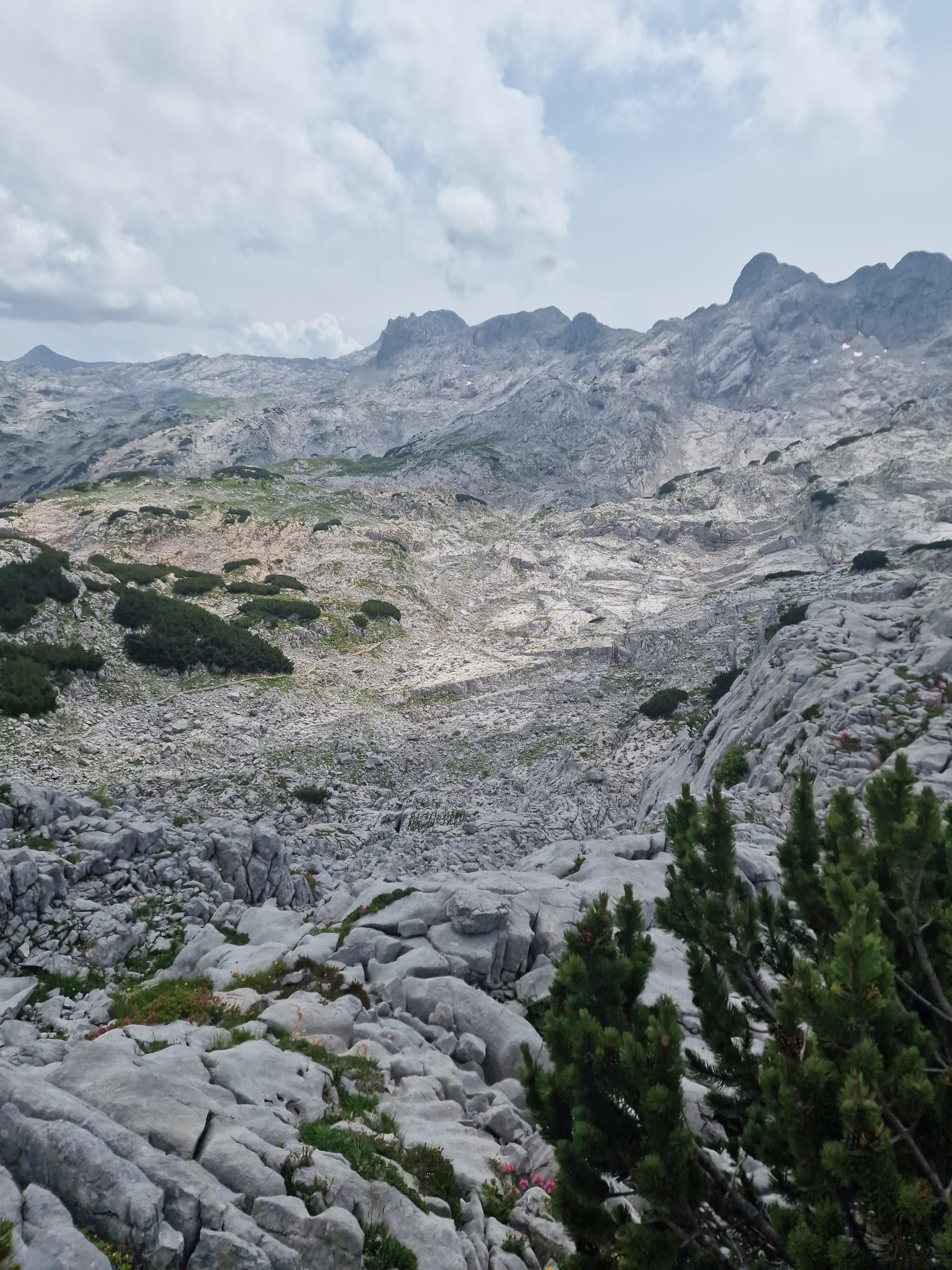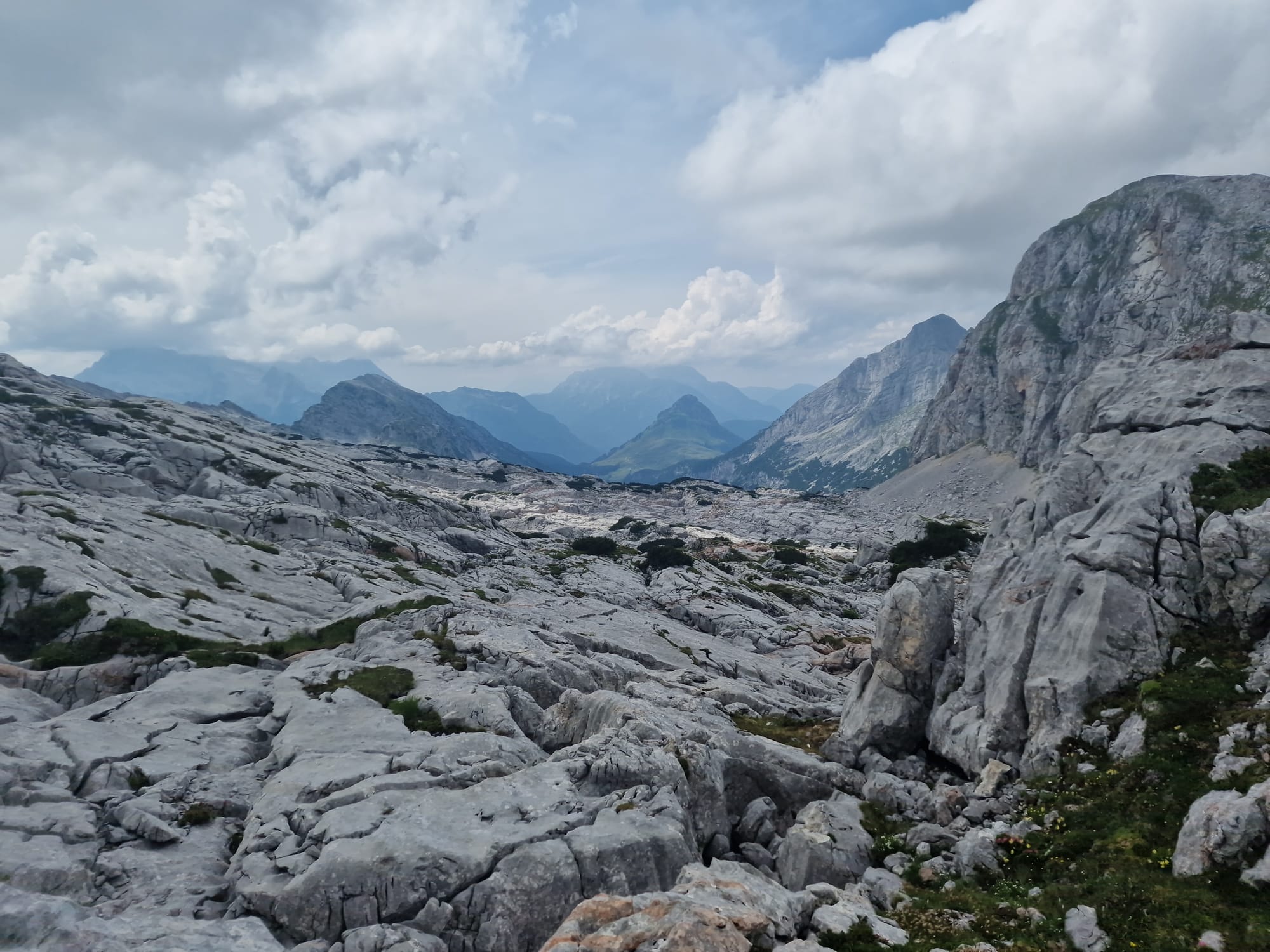 Das Kärlingerhaus liegt noch in Deutschland und daher überschritten wir auf dem Weg zum steinernen Meer unbemerkt die Grenze zu Österreich. Das steinerne Meer selbst wirkt wir eine felsgewordene Mondlandschaft, bis auf einige kleine Grasflächen mit noch weniger Krüppelkiefern in den niedrigen Lagen befindet sich nur Stein, so weit das Auge blicken kann.