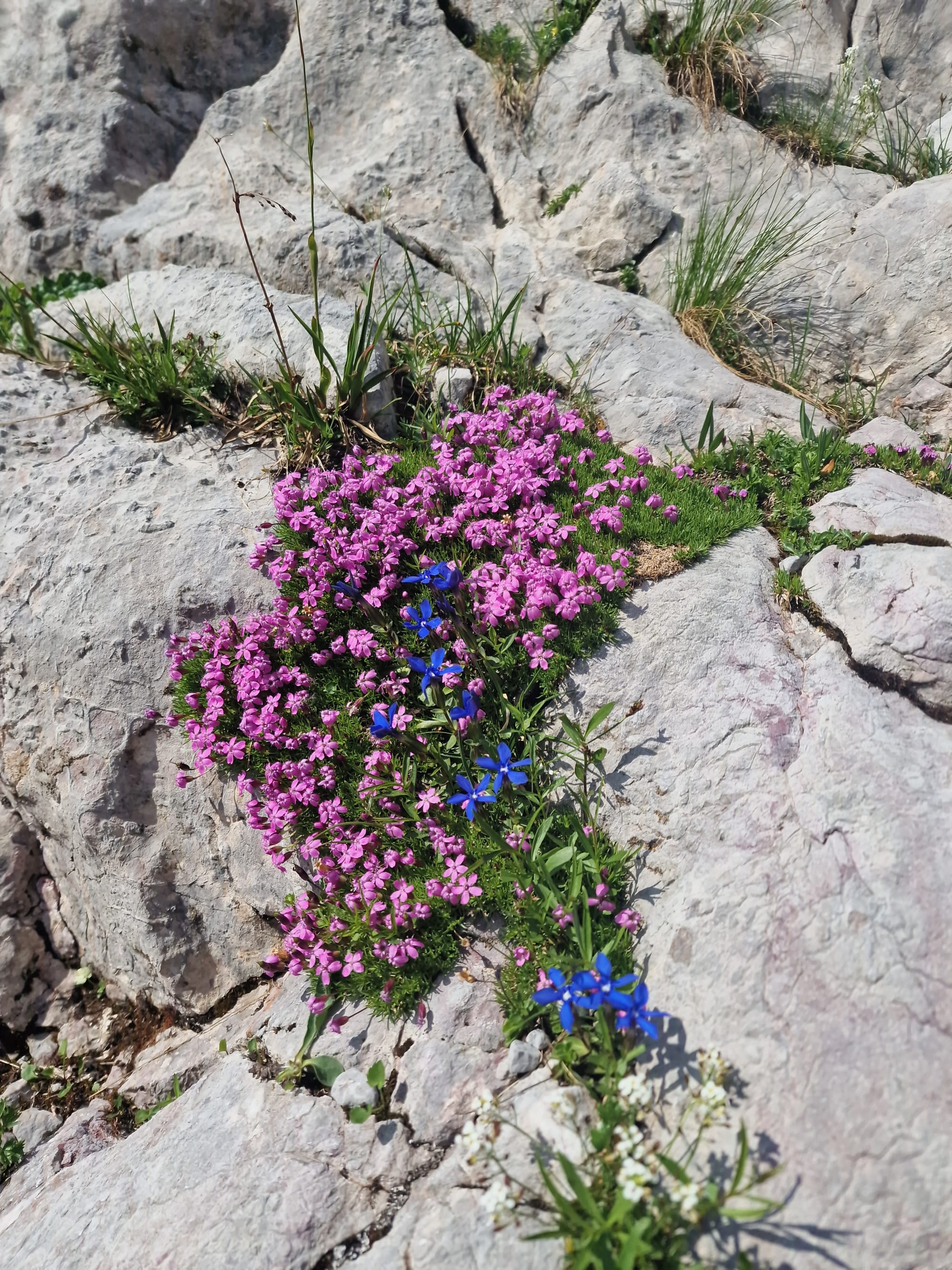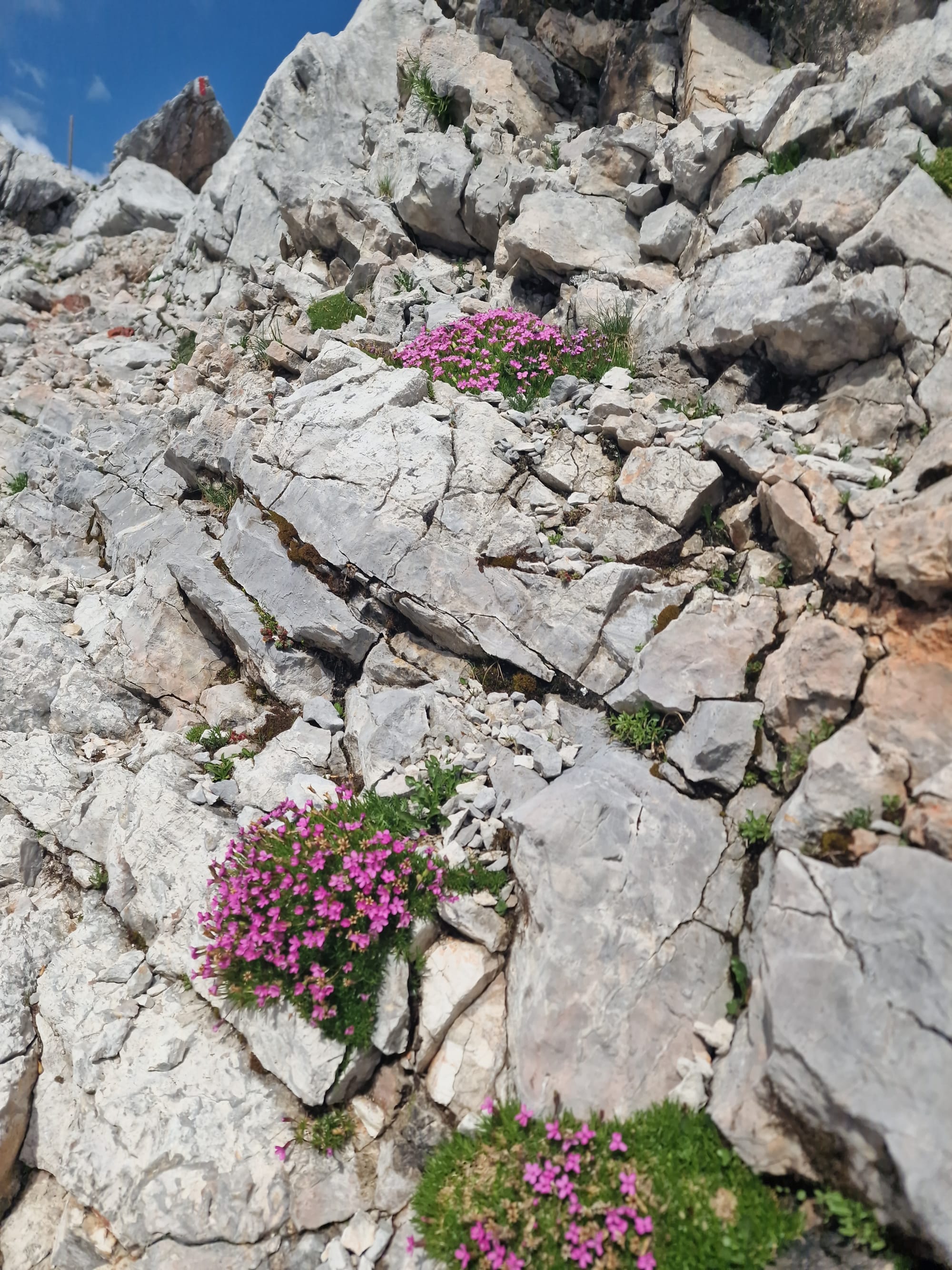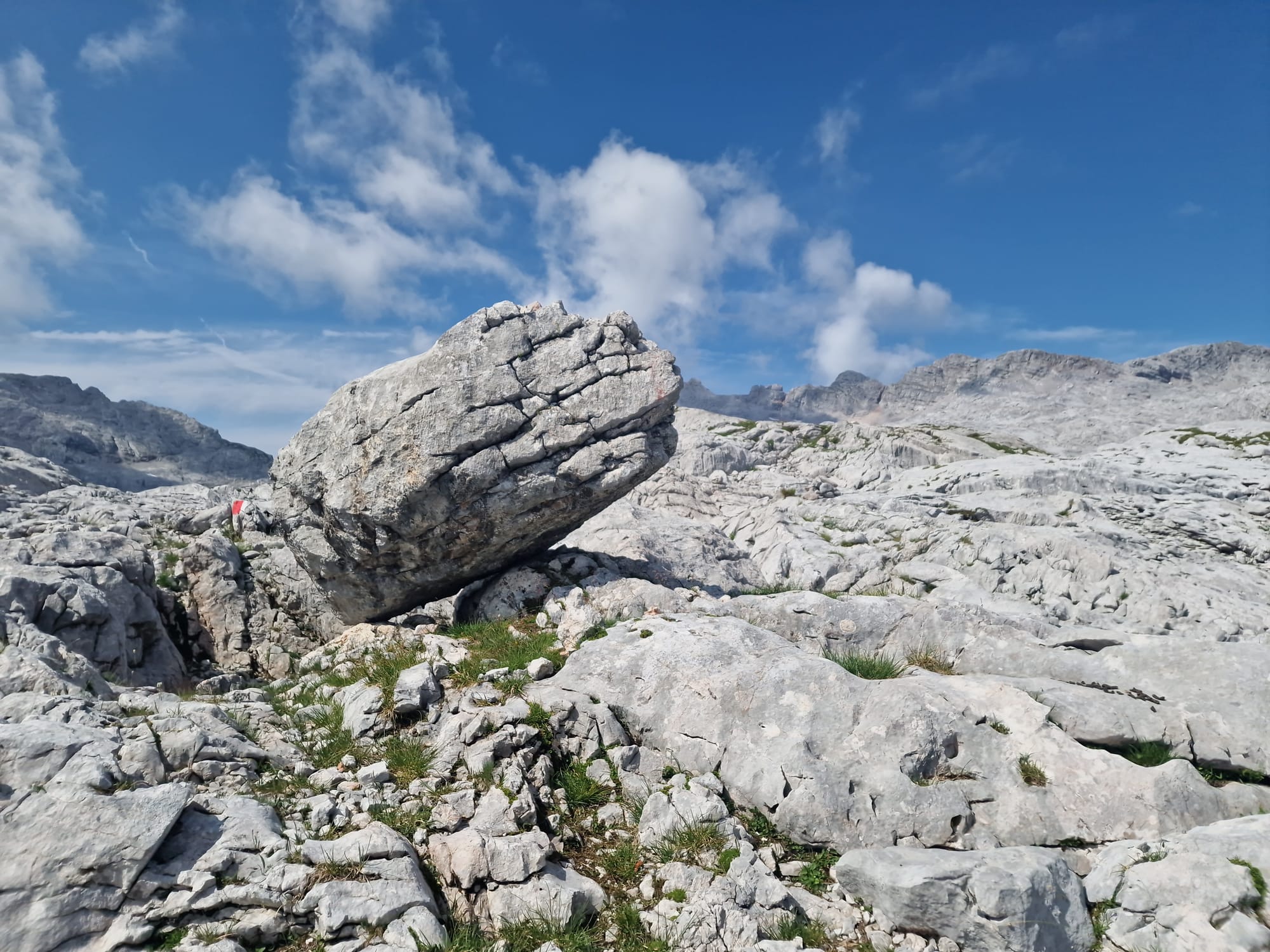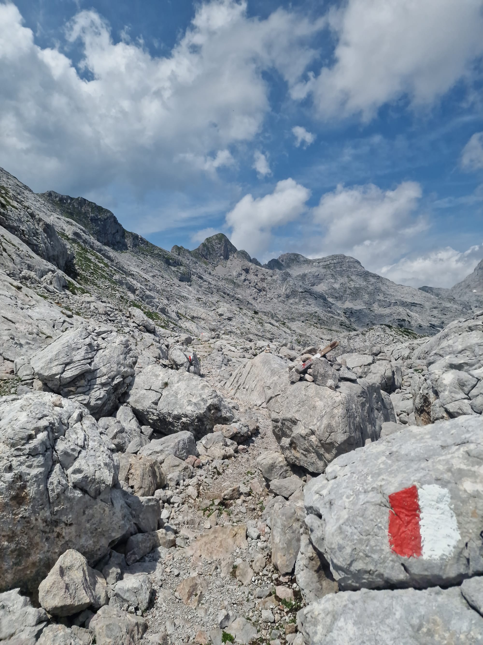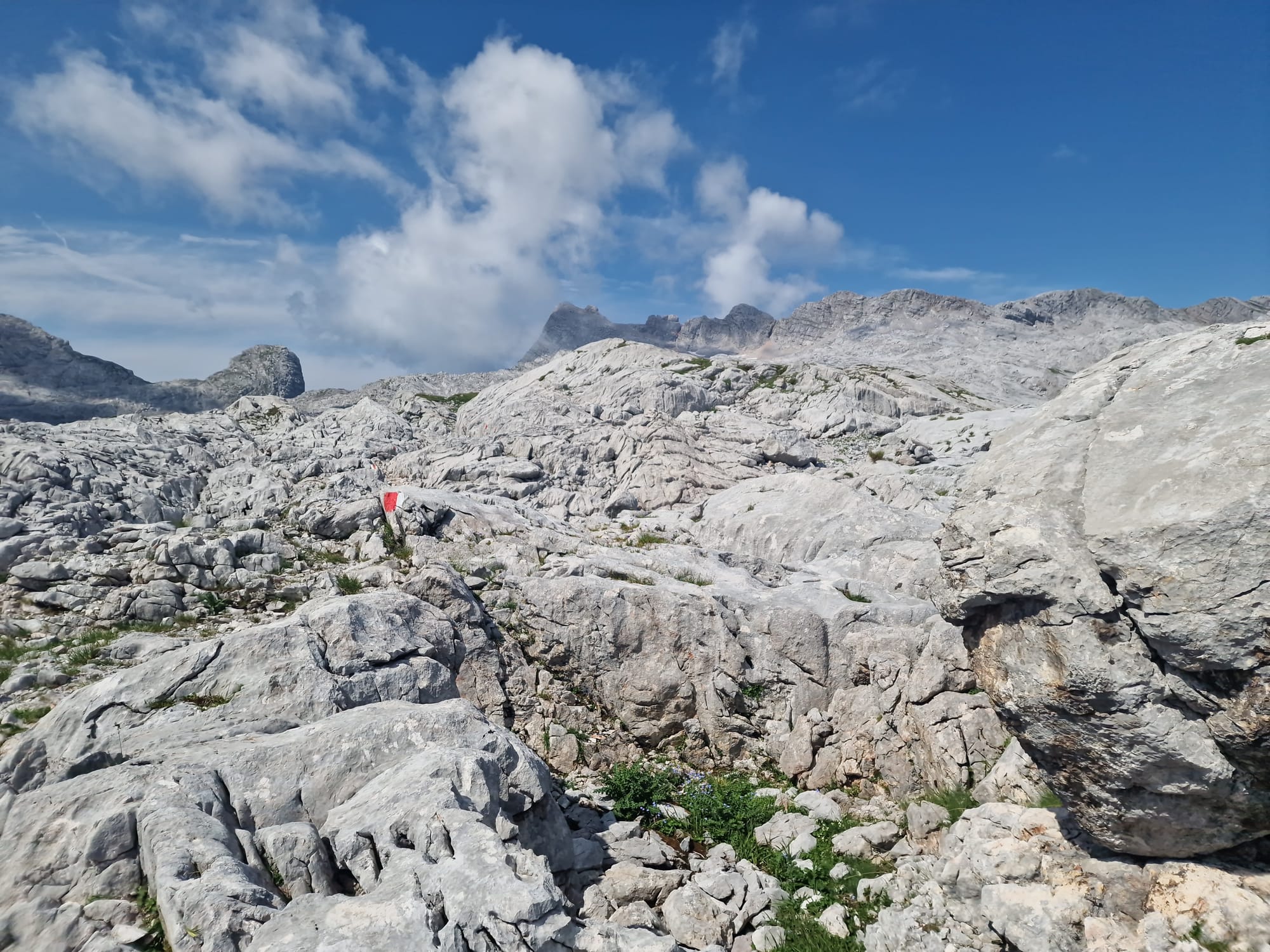 Das Kärlingerhaus liegt noch in Deutschland und daher überschritten wir auf dem Weg zum steinernen Meer unbemerkt die Grenze zu Österreich. Das steinerne Meer selbst wirkt wir eine felsgewordene Mondlandschaft, bis auf einige kleine Grasflächen mit noch weniger Krüppelkiefern in den niedrigen Lagen befindet sich nur Stein, so weit das Auge blicken kann.