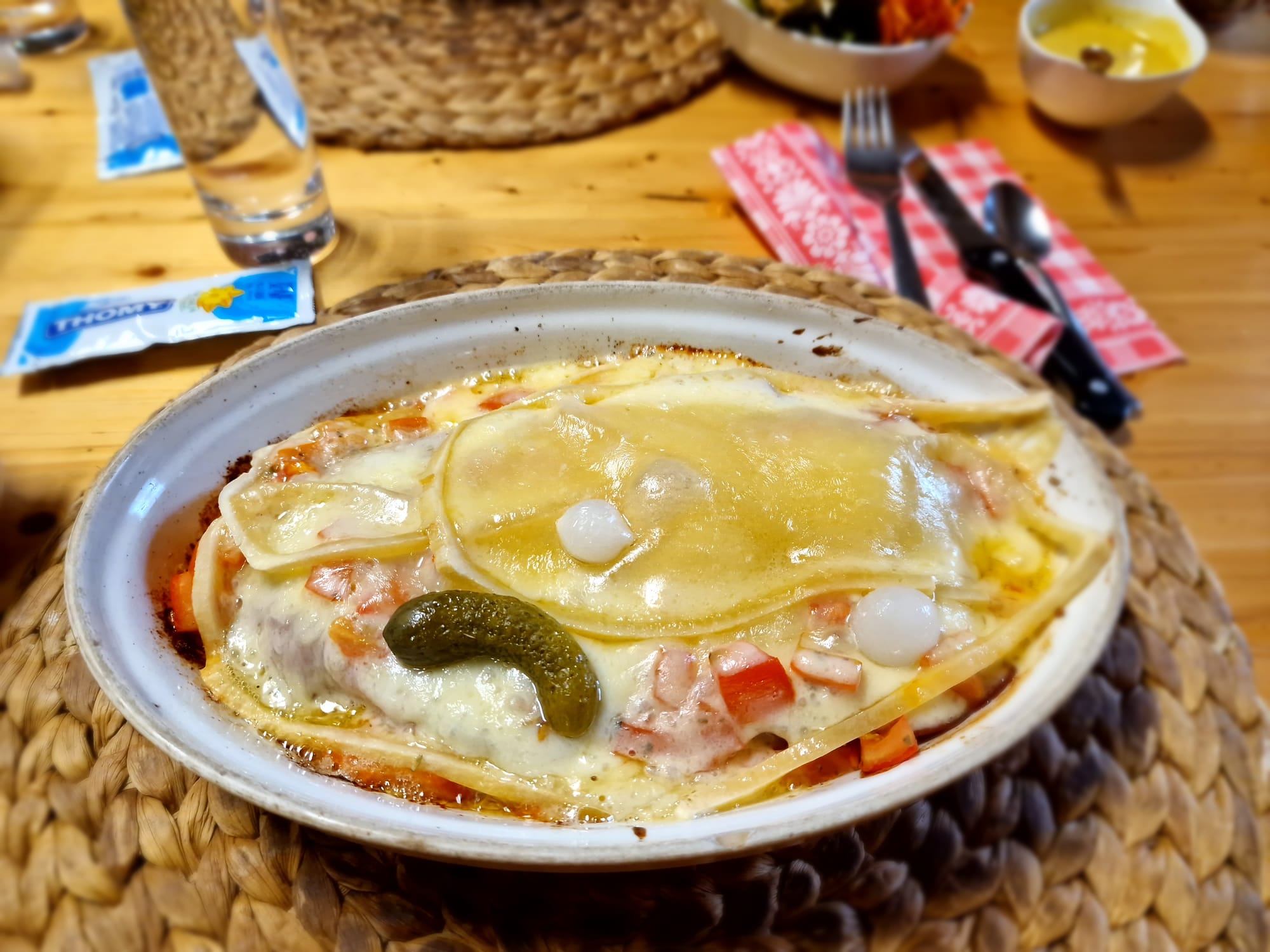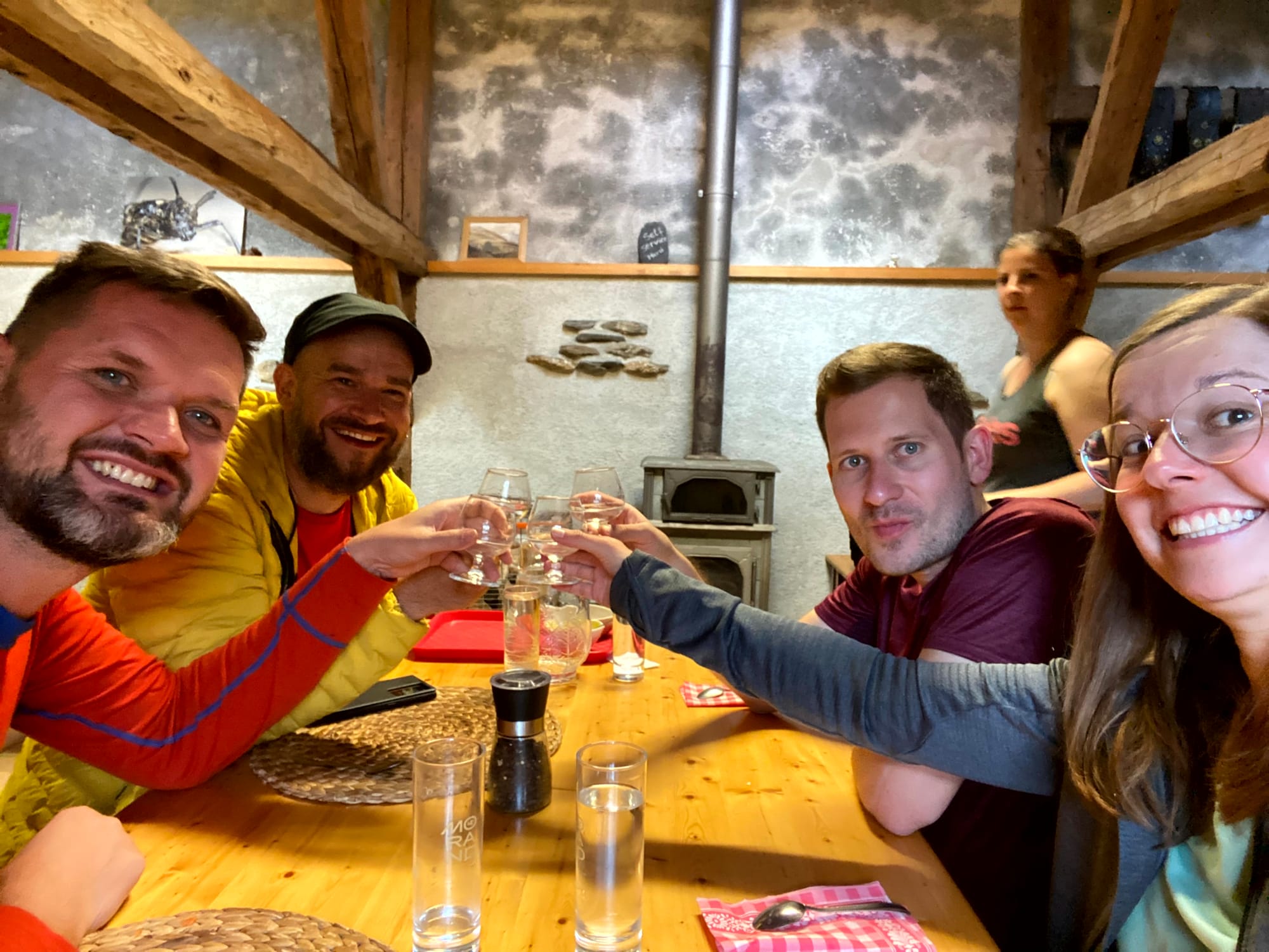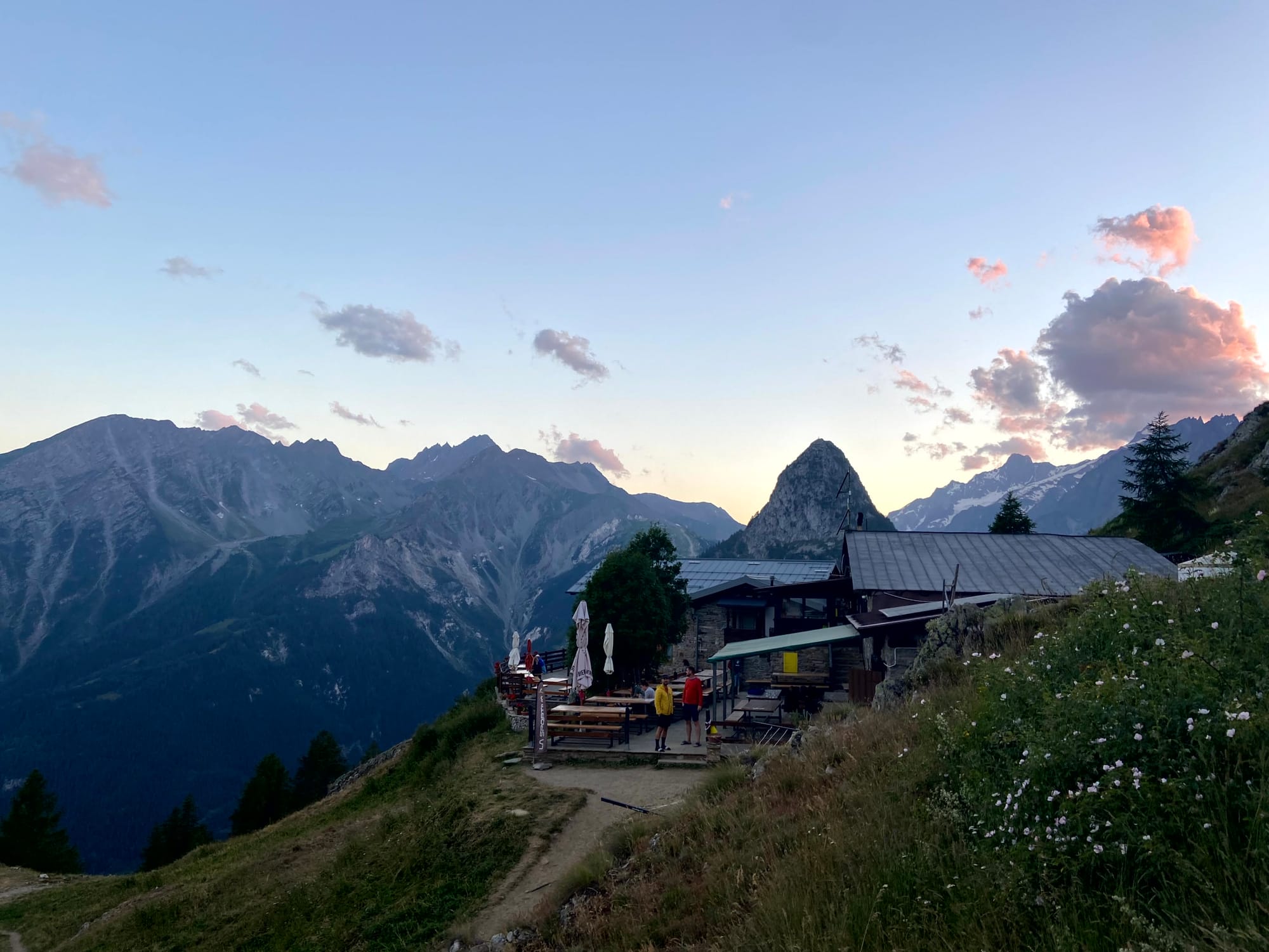 Wenig später kamen auch Mareike und Felix an, die sich etwas mehr Zeit gelassen hatten und den Weg entspannter gelaufen waren. In dem Schweizer Chalet de la Peule hatten wir das beste Abendessen, an das ich mich erinnere, einen Auflauf, bei dem mir heute noch das Wasser im Mund zusammenläuft.