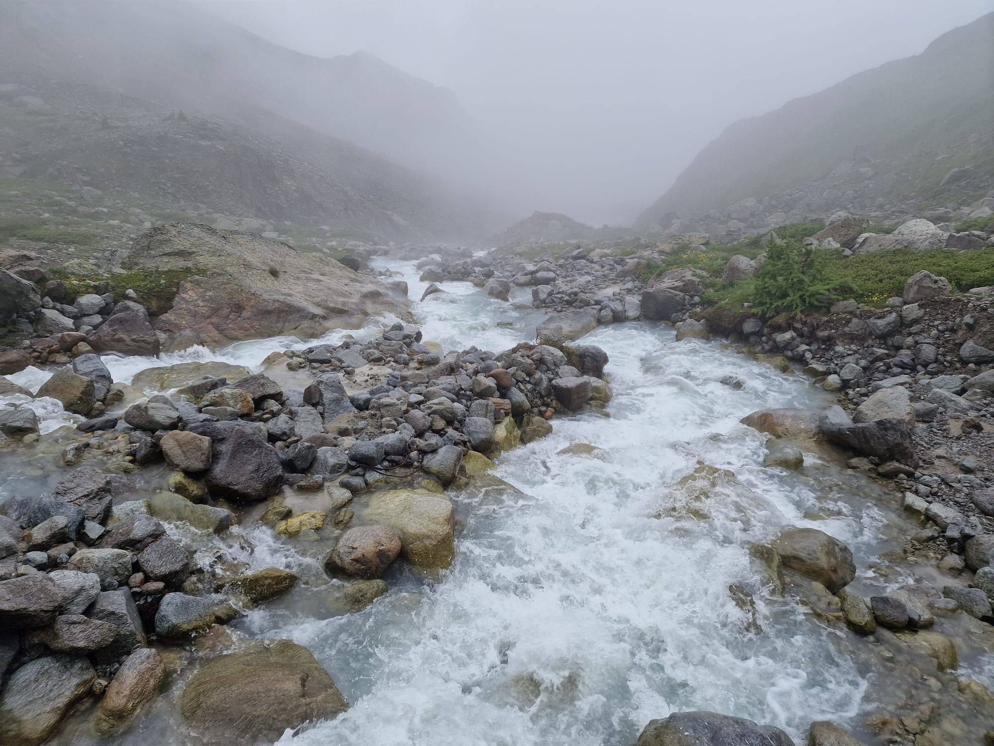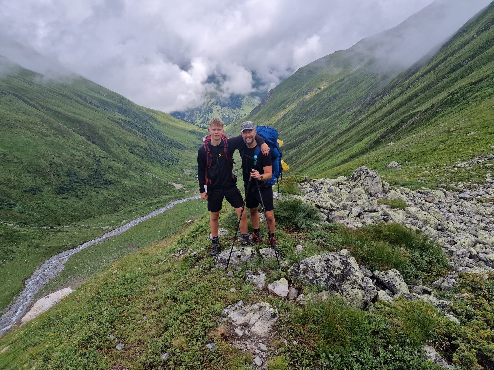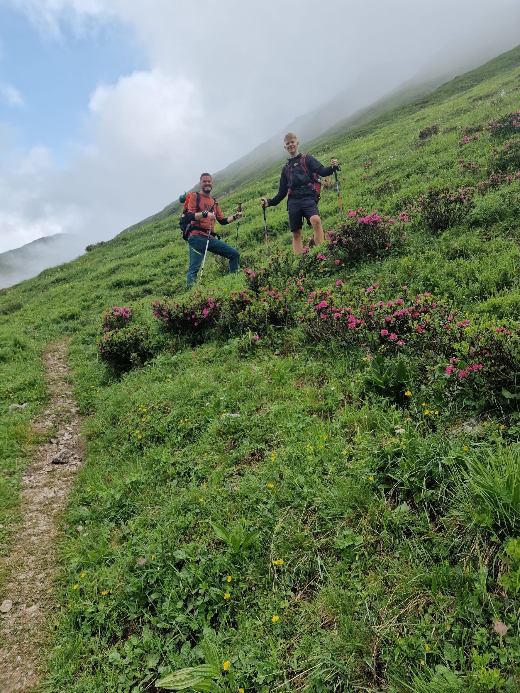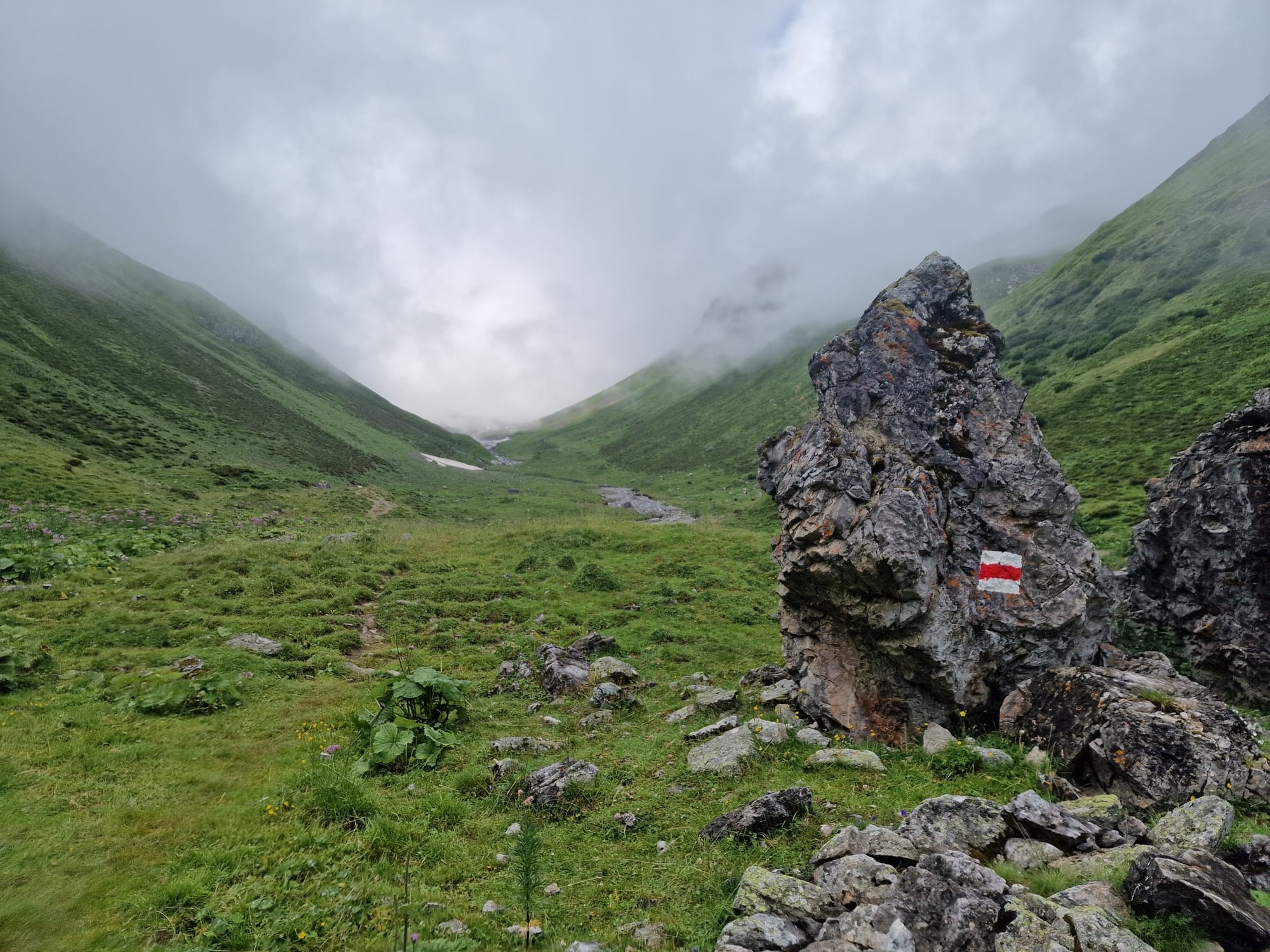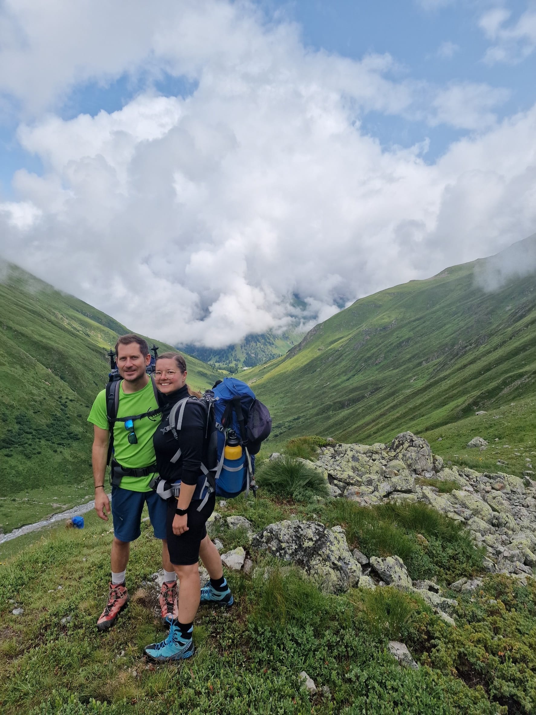 Am dritten Tag auf unserem Kesch-Trek liefen wir zunächst viele Meter ins Tal hinab, in dichten Wolken und teilweise auch einigen kleinen Regenschauern. Aber das machte uns alles nichts aus.