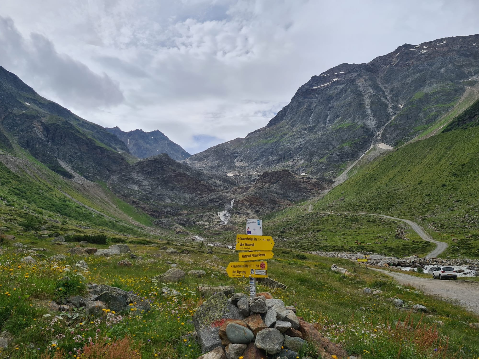 In Wenns wurden wir erneut von einem Kleinbus eingesammelt, um das lange und zu Fuß recht öde zu laufende Pitztal bis nach Mittelberg zu überbrücken. Von dort hieß es erneut, auf in die Berge, hinauf zur Braunschweiger Hütte.