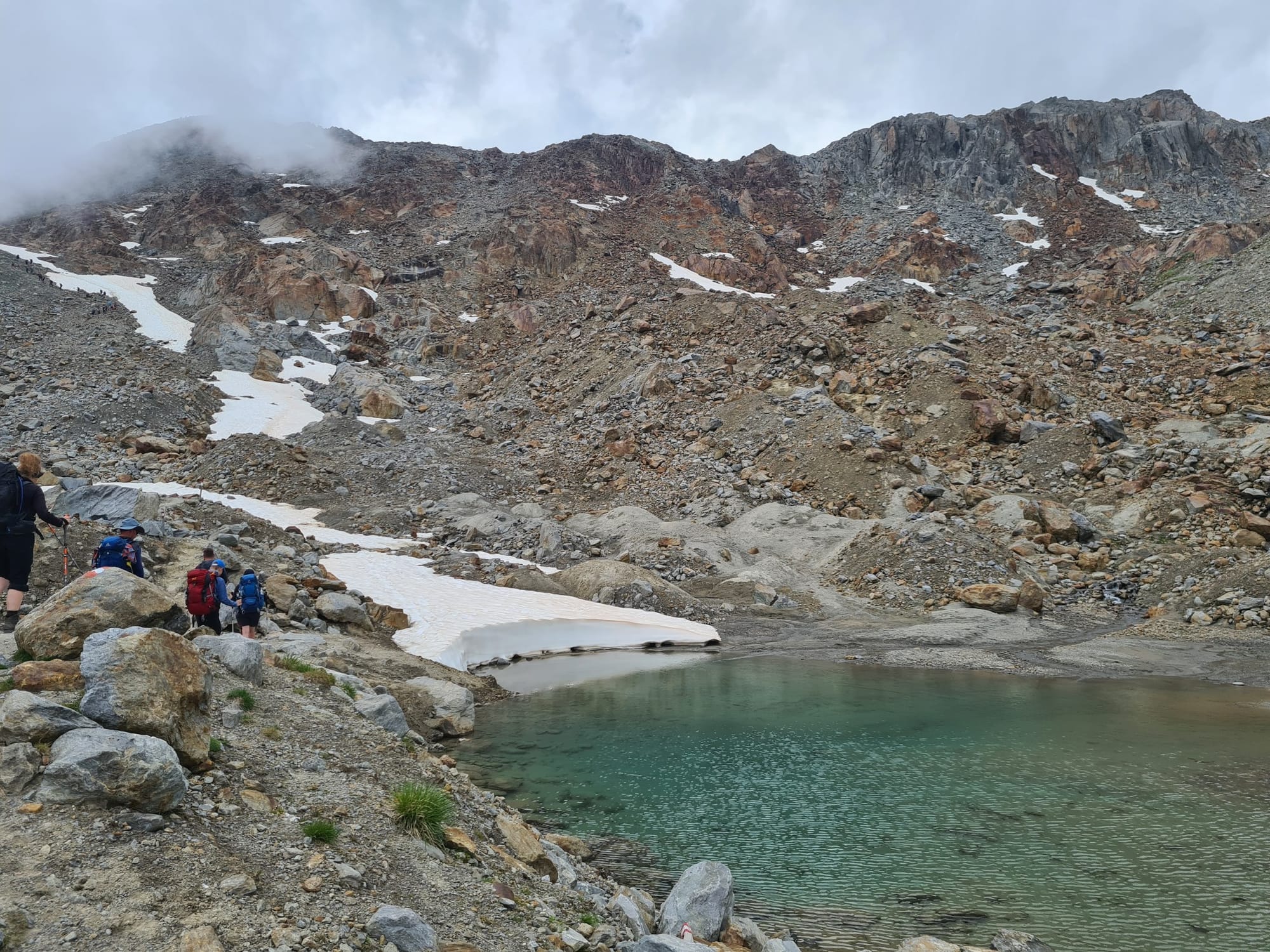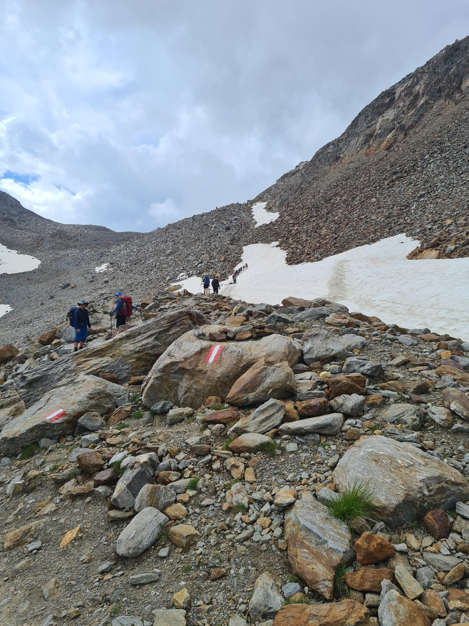 Nach einer kurzen Erfrischung wurde der Weg nun steiniger, schmaler und um Längen schöner. So kamen wir unweit der Fundstelle des weltberühmten Ötzi vorbei und erreichten nach einigen Schneefeldern die Similaun-Hütte.