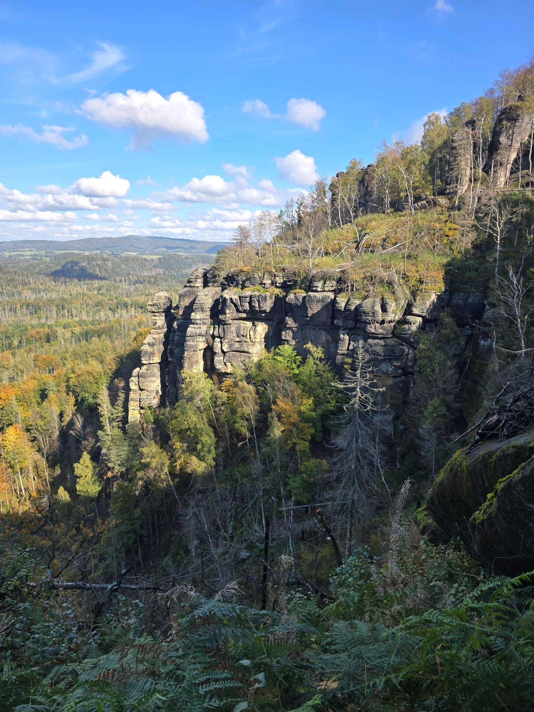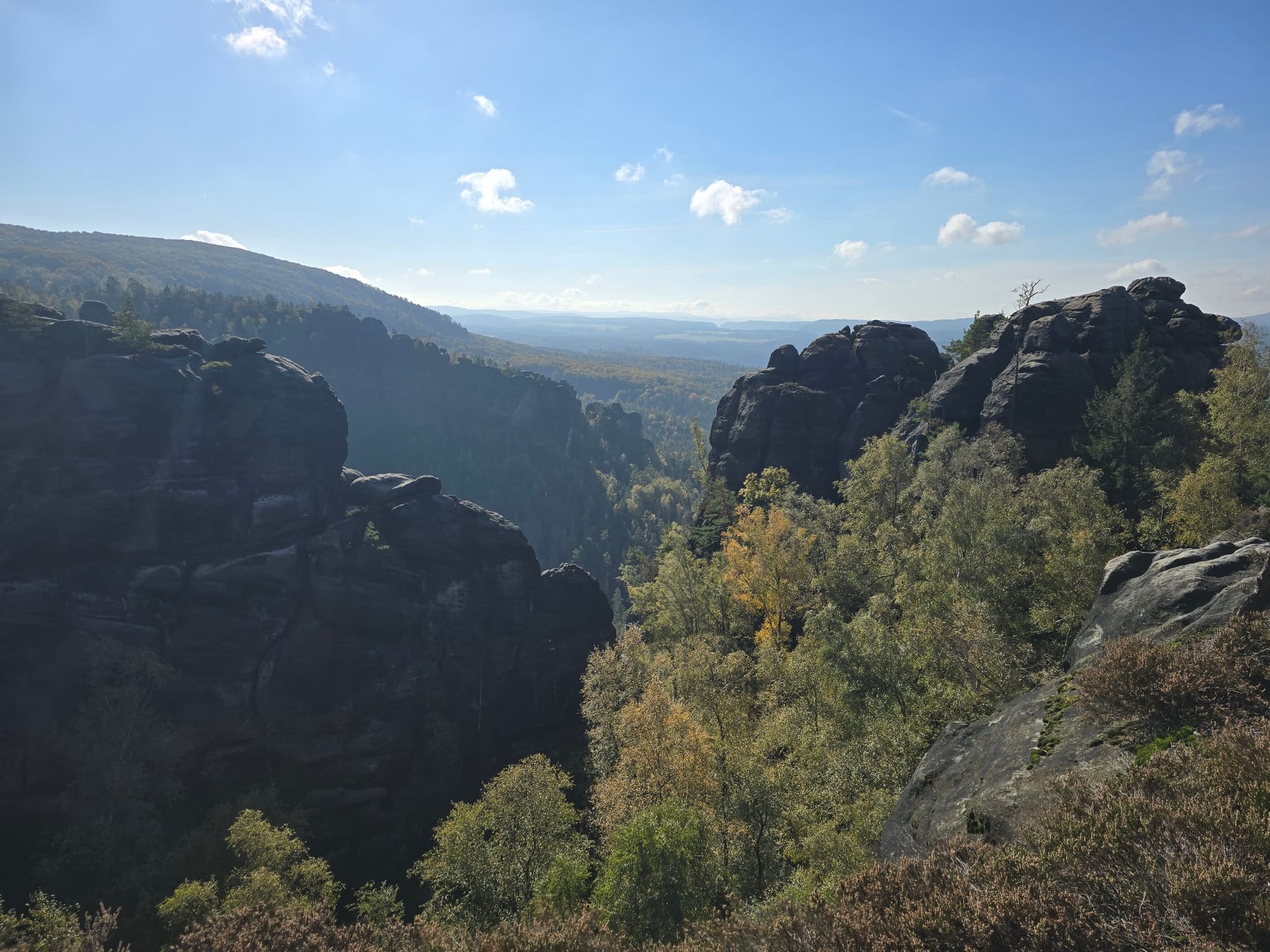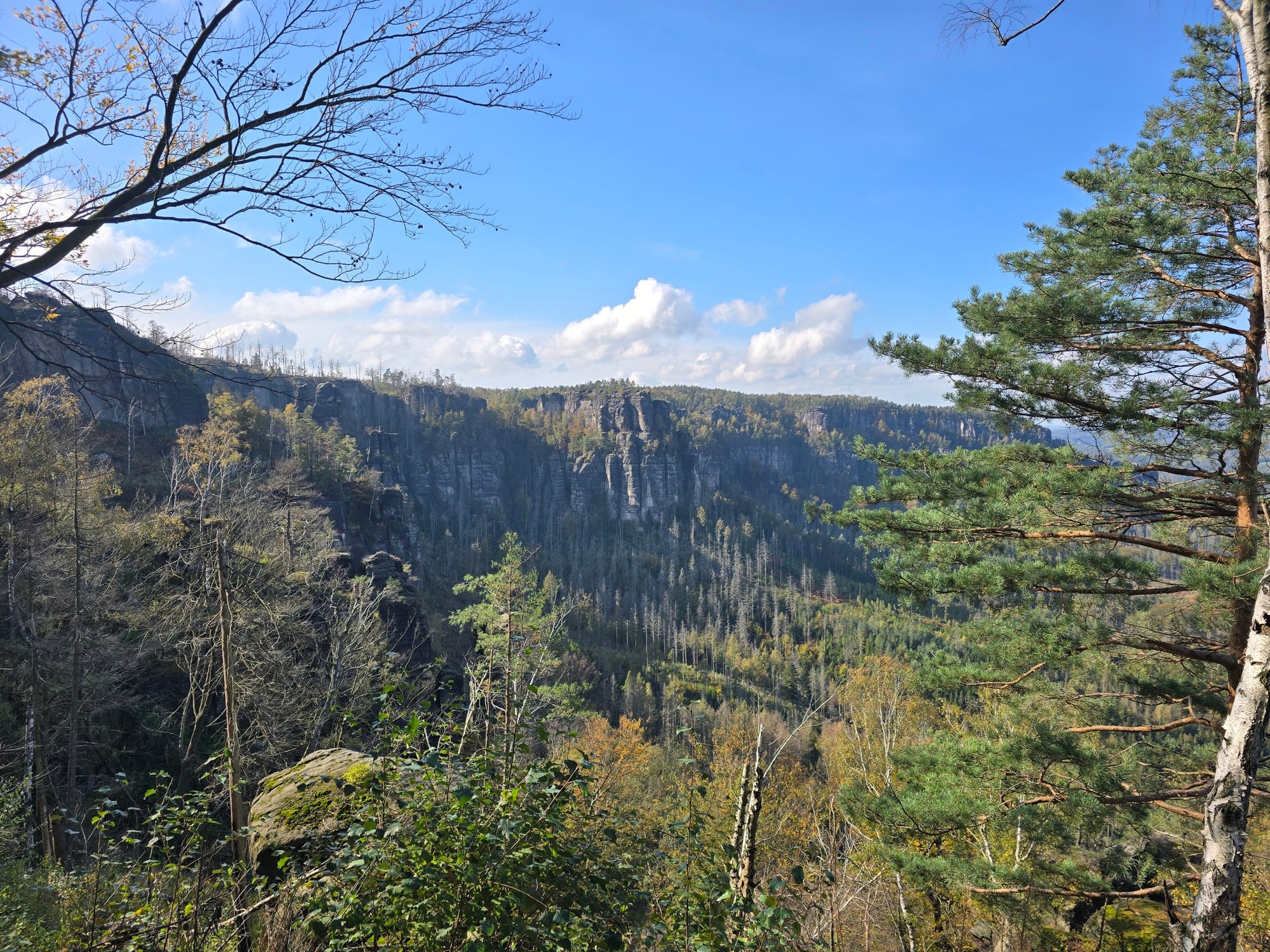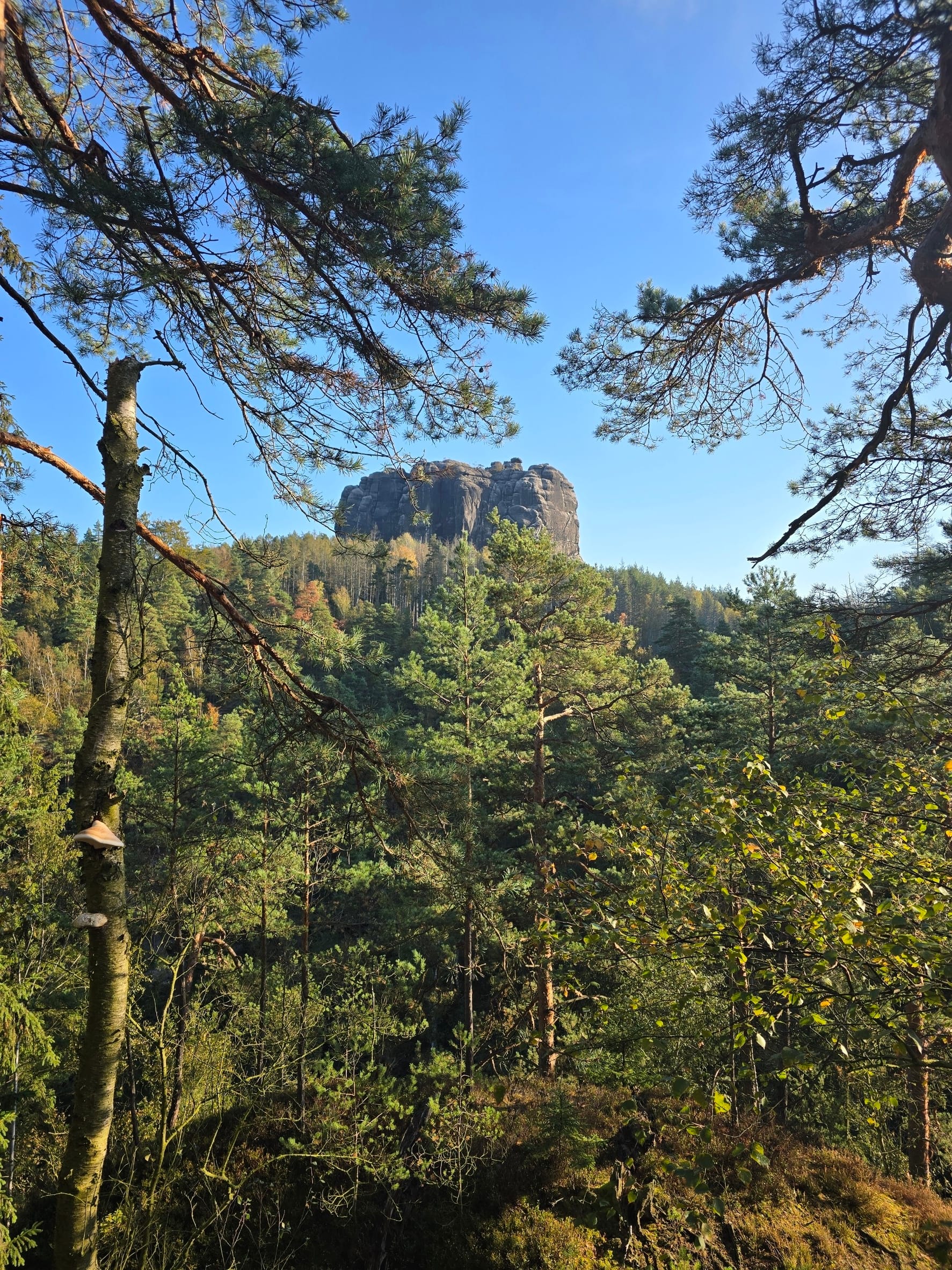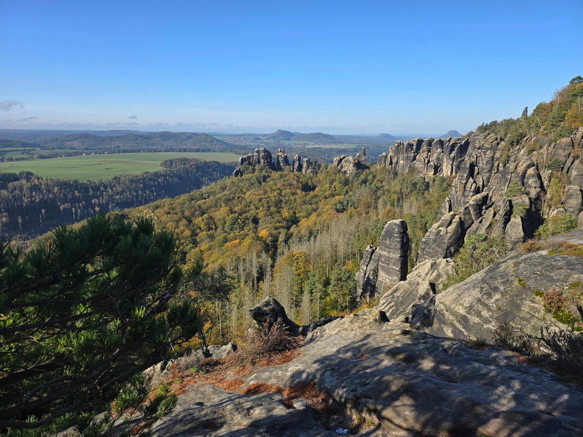 An diesem sonnigen Oktobertag parkte ich das Auto an der Falkensteinbaude, unterhalb gibt es noch einen gebührenfreien Parkplatz. Von dort startete ich über den Obrigensteig in Richtung des Schrammtorwächters, um danach über die vordere Promenade und den geliebten Wildschützensteig auf die Schrammsteinaussicht zu gelangen.