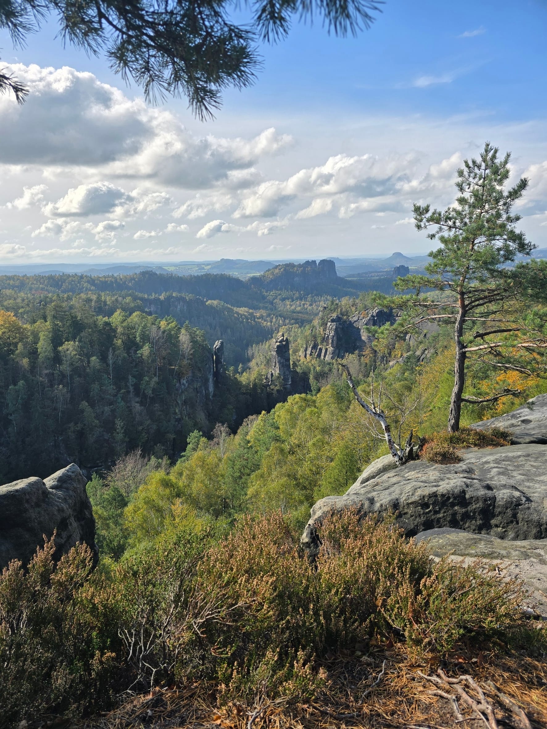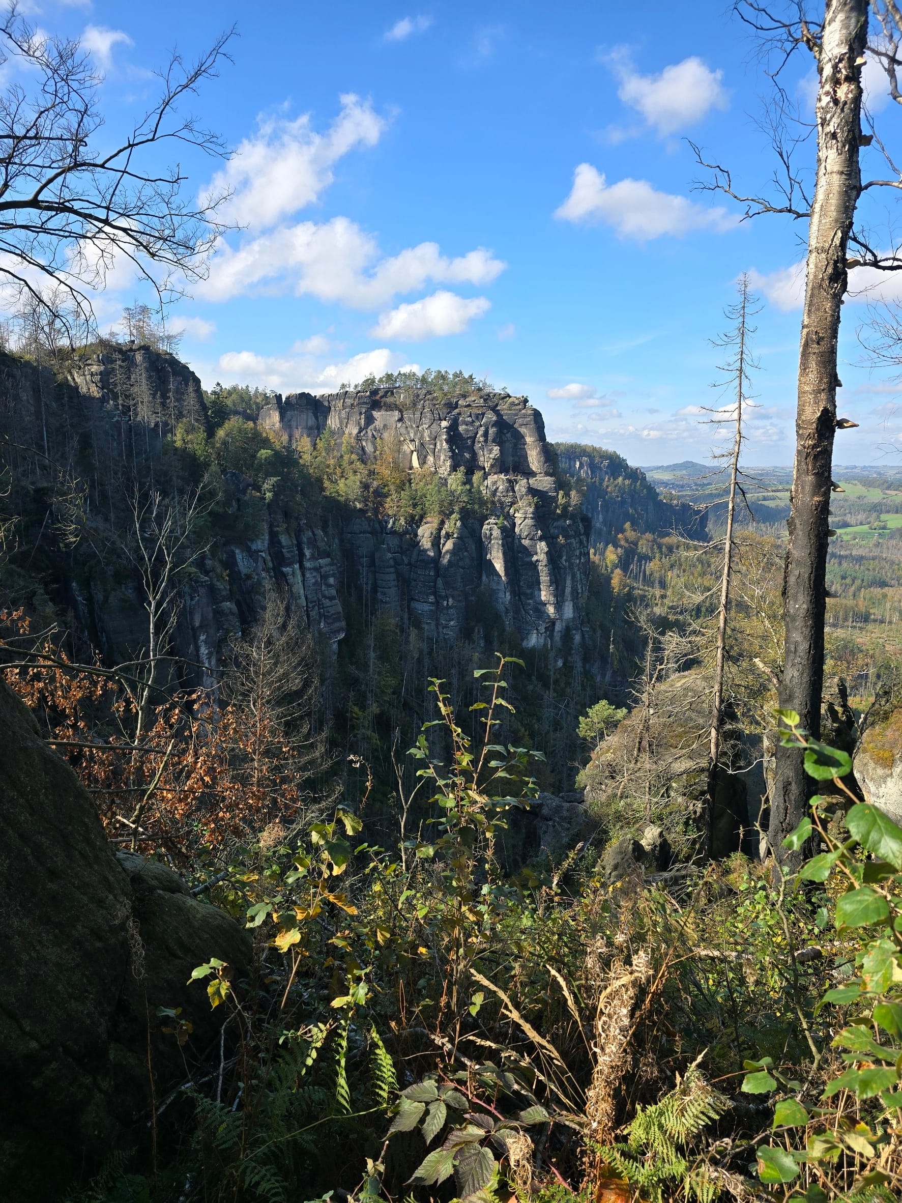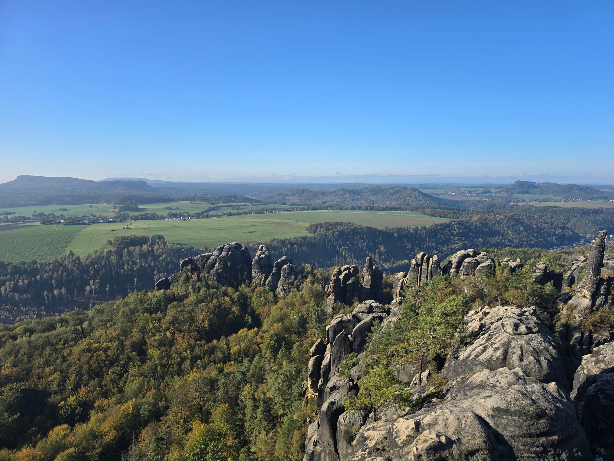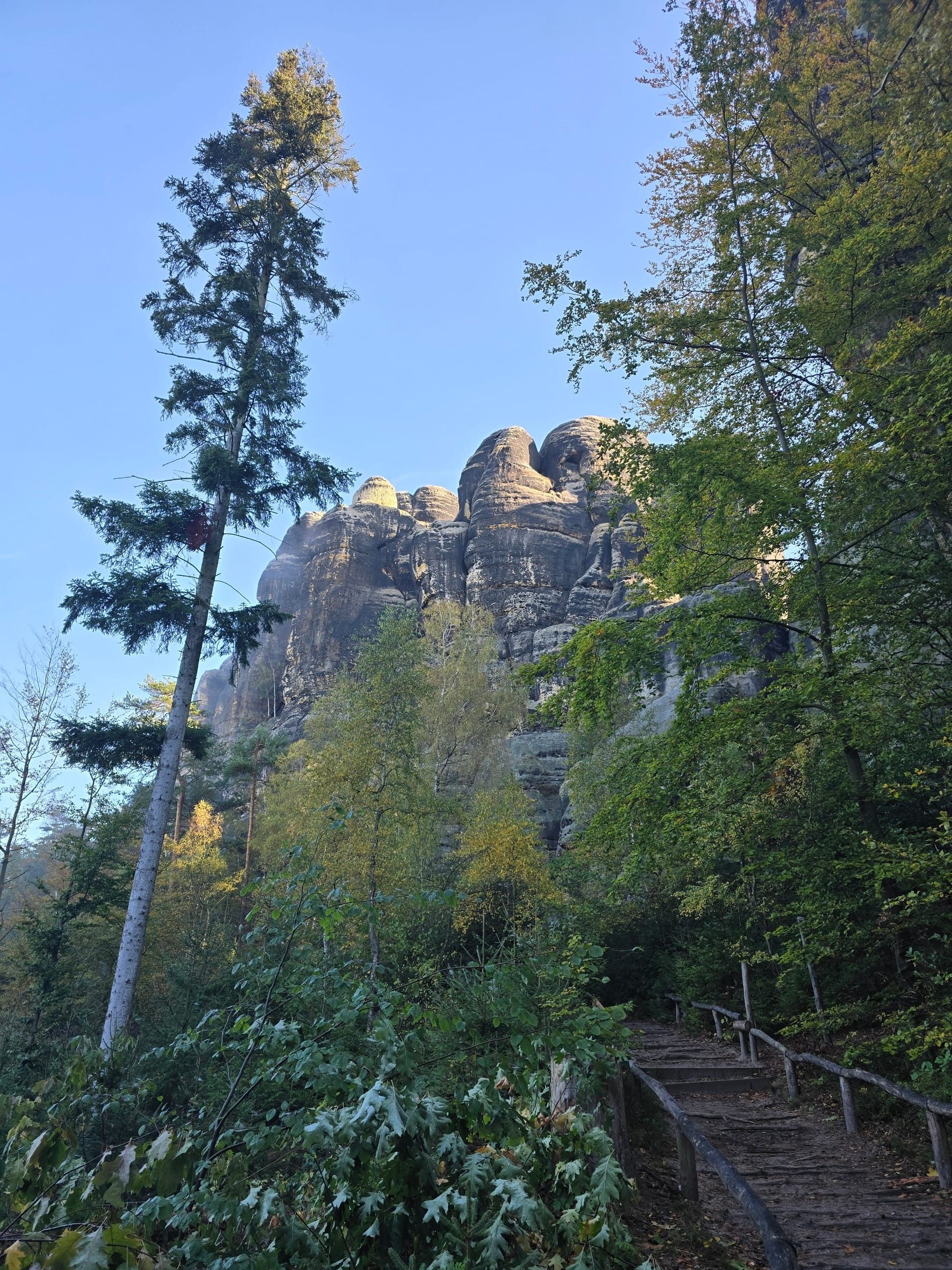 An diesem sonnigen Oktobertag parkte ich das Auto an der Falkensteinbaude, unterhalb gibt es noch einen gebührenfreien Parkplatz. Von dort startete ich über den Obrigensteig in Richtung des Schrammtorwächters, um danach über die vordere Promenade und den geliebten Wildschützensteig auf die Schrammsteinaussicht zu gelangen.