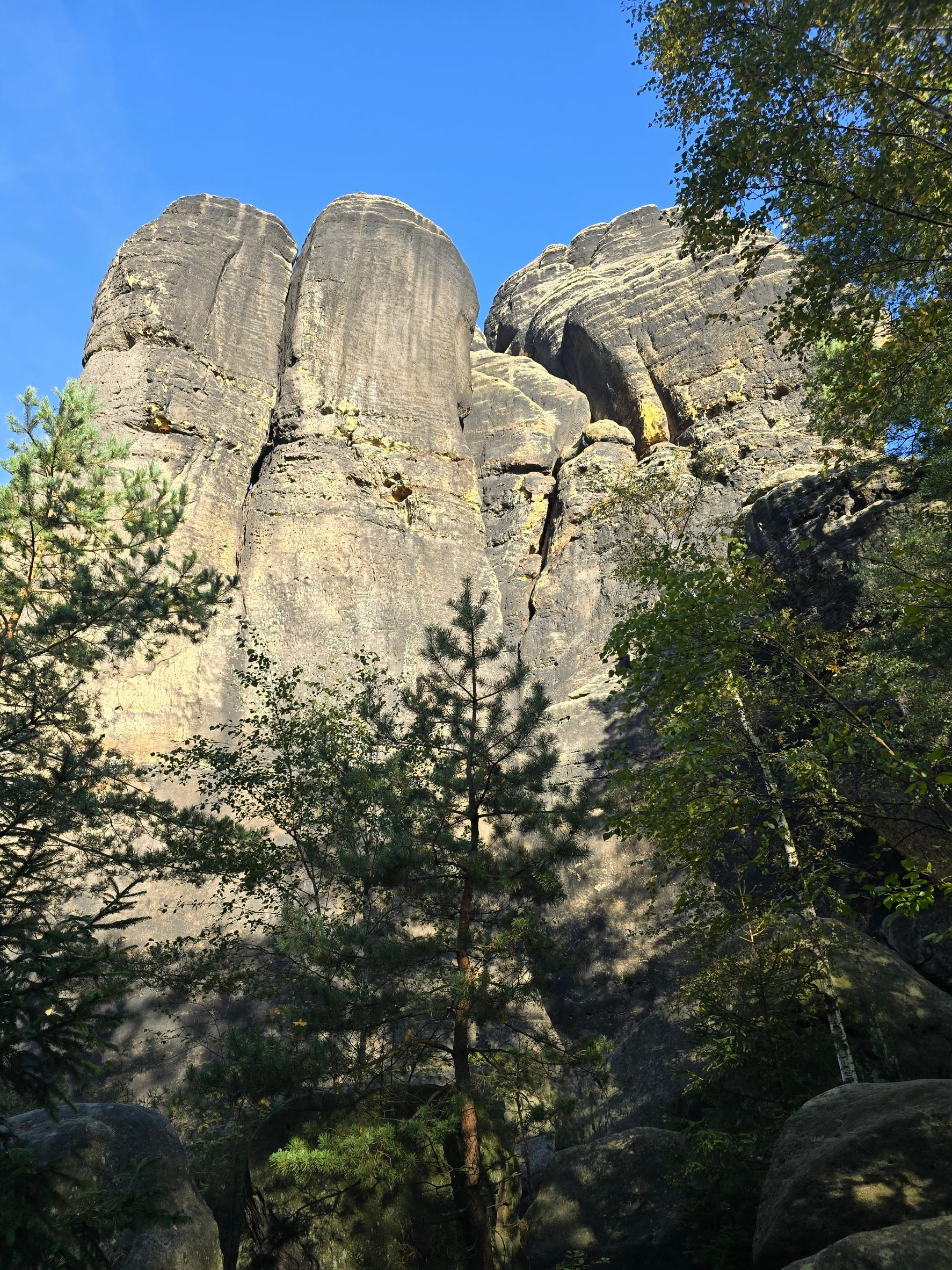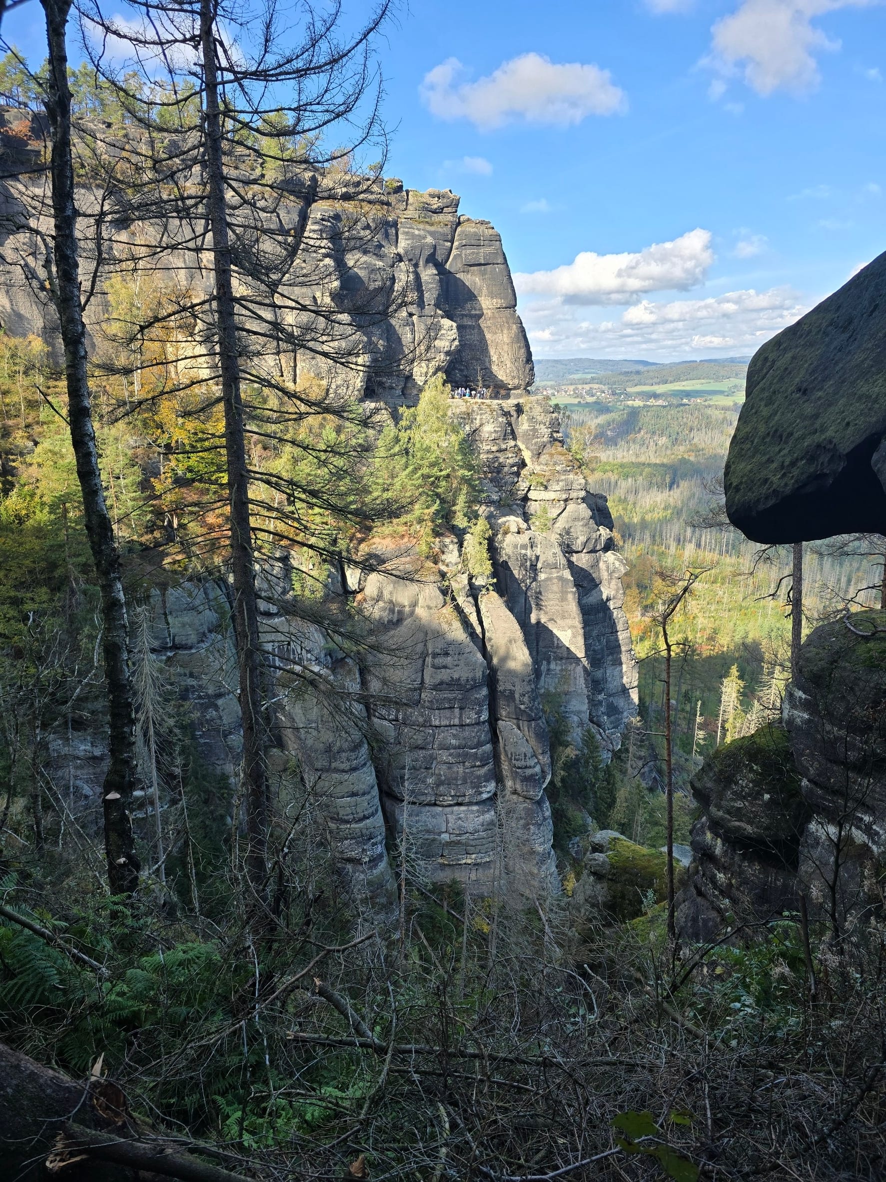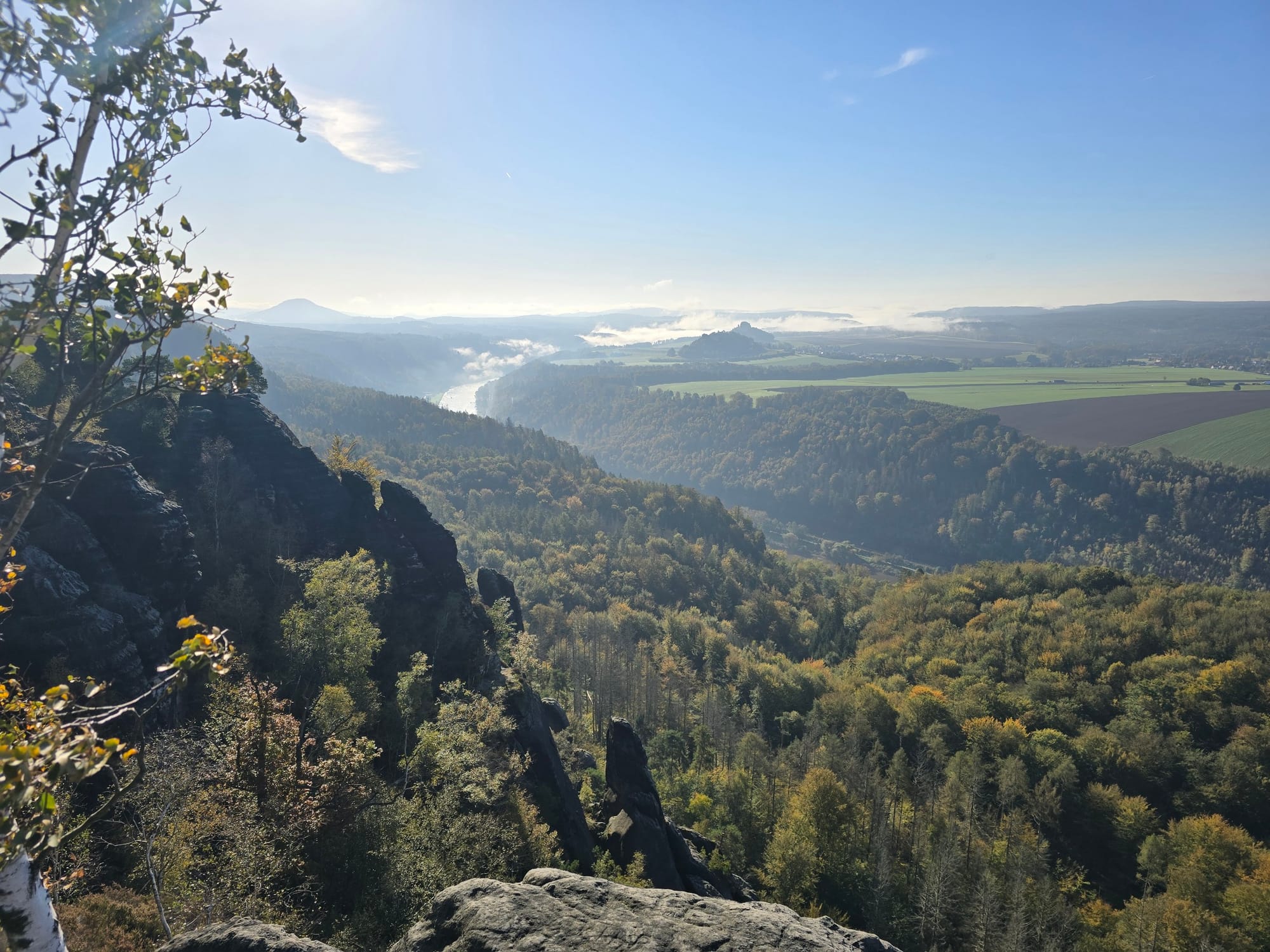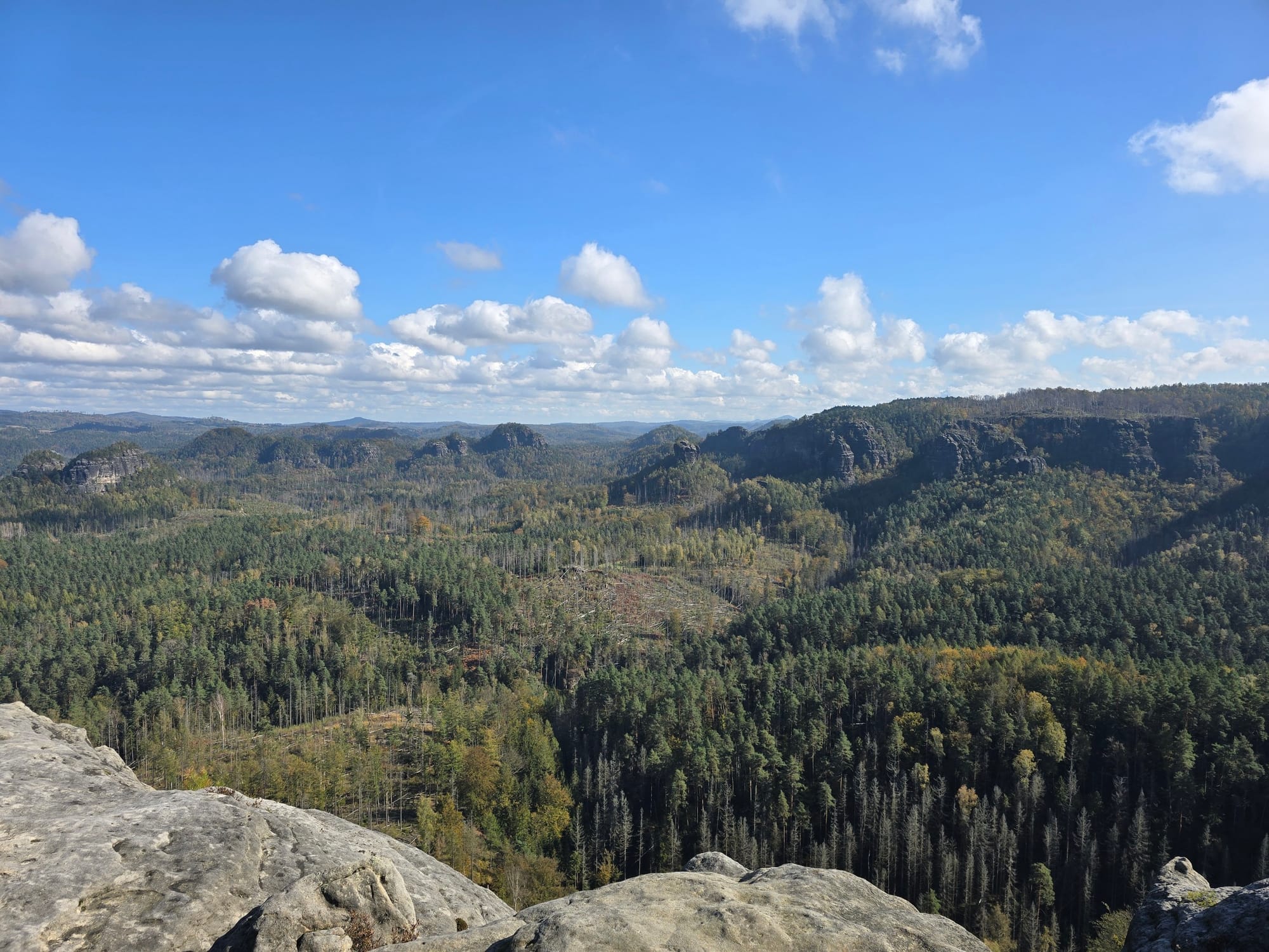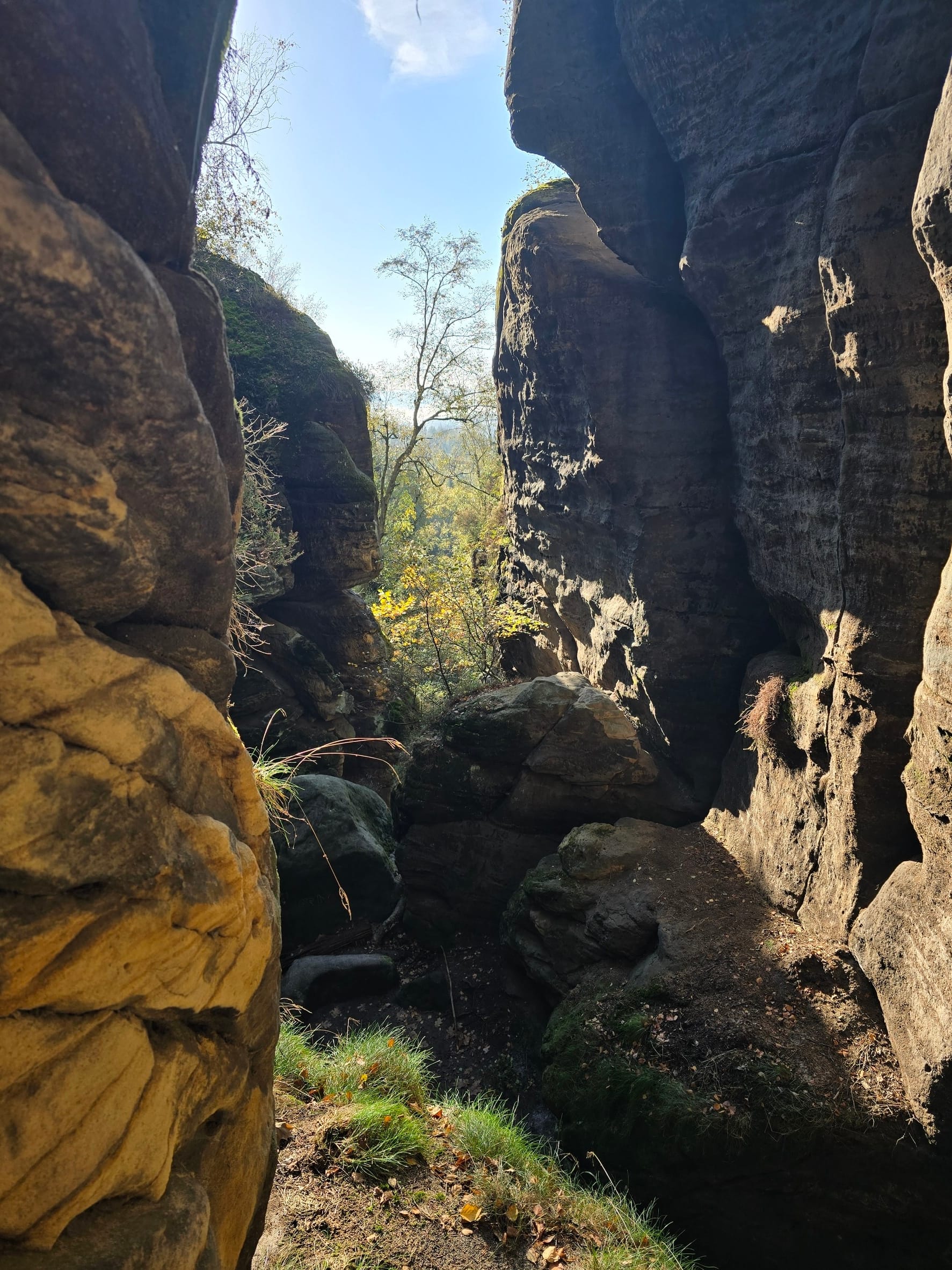 An diesem sonnigen Oktobertag parkte ich das Auto an der Falkensteinbaude, unterhalb gibt es noch einen gebührenfreien Parkplatz. Von dort startete ich über den Obrigensteig in Richtung des Schrammtorwächters, um danach über die vordere Promenade und den geliebten Wildschützensteig auf die Schrammsteinaussicht zu gelangen.
