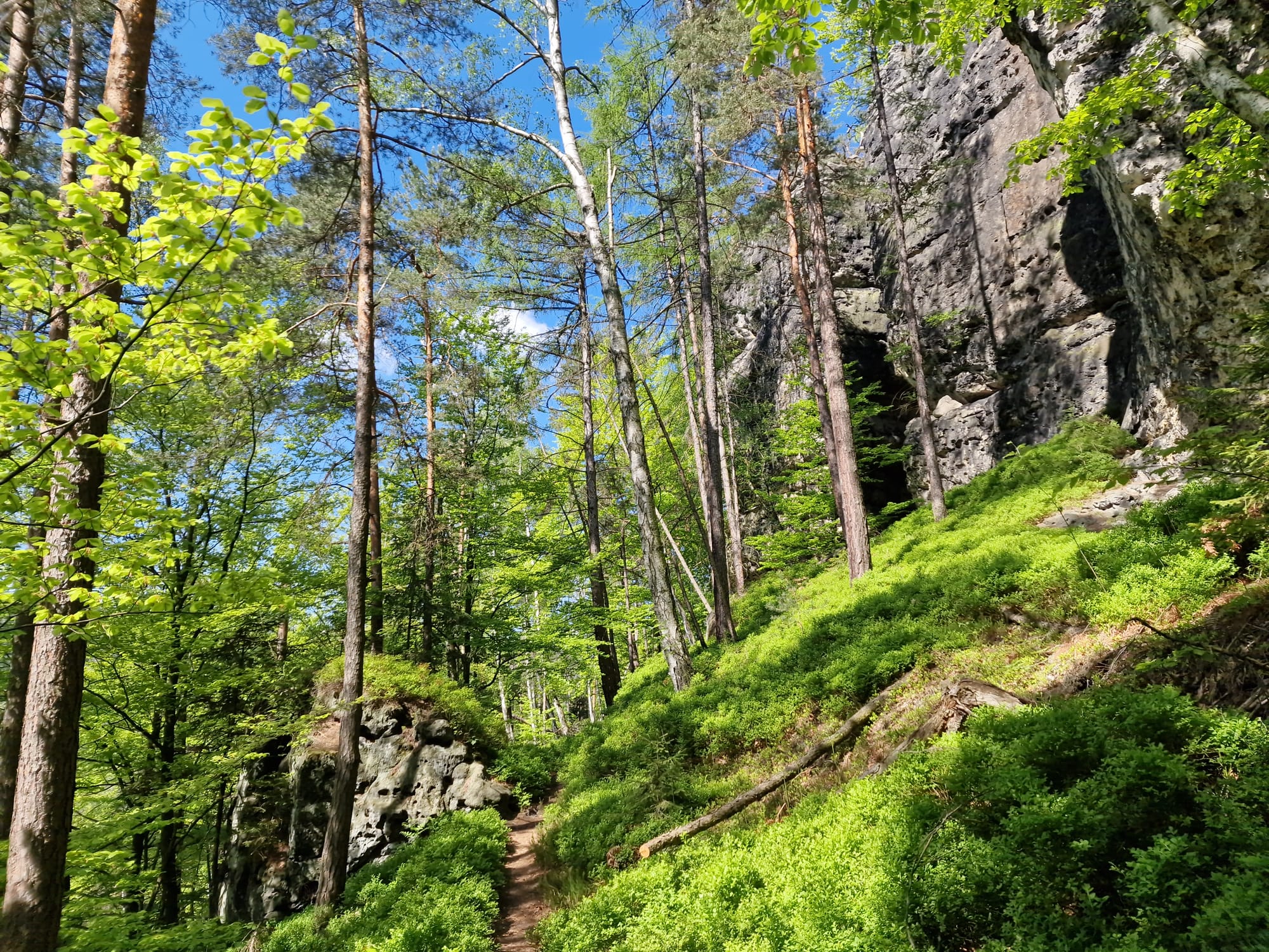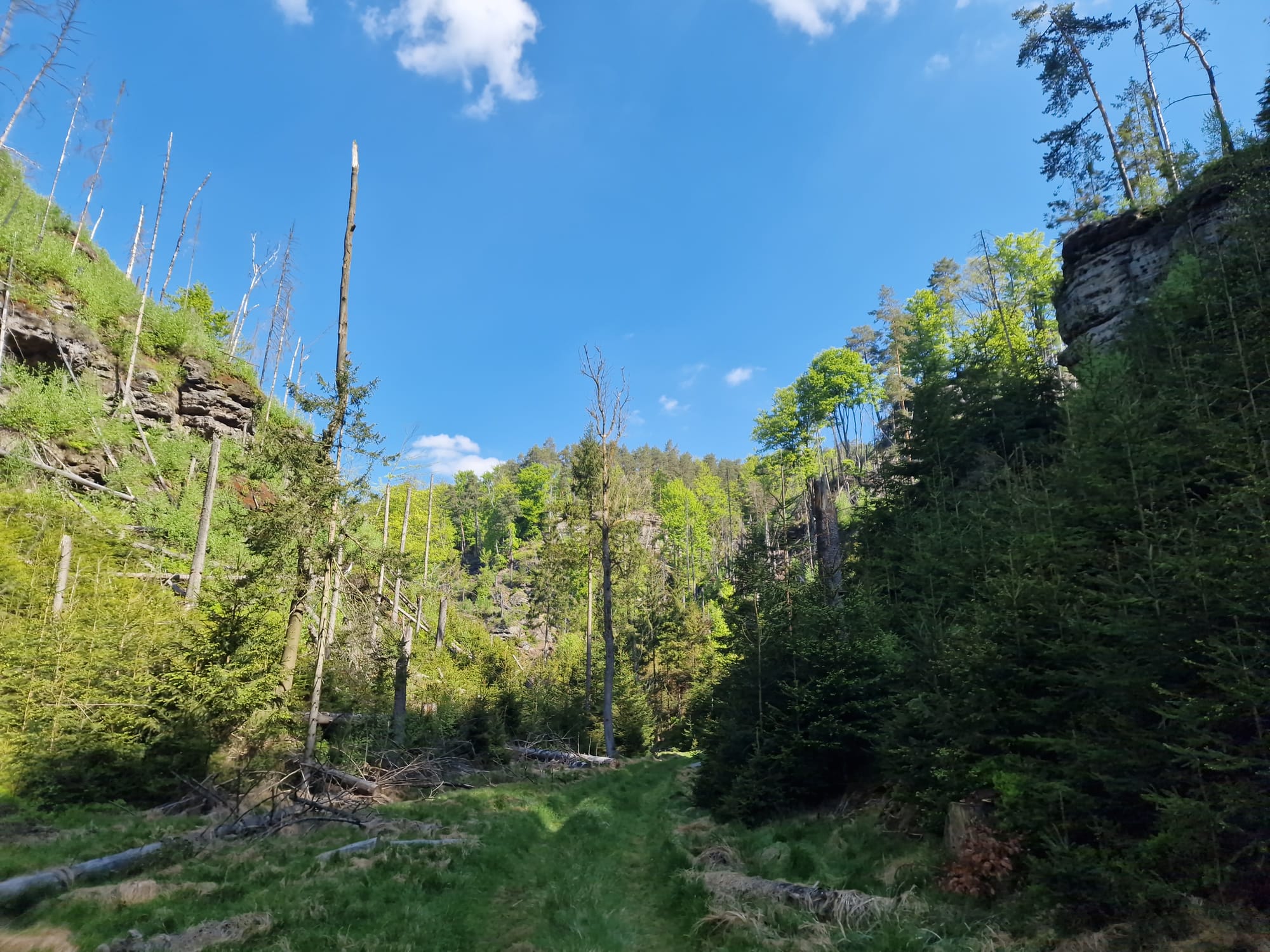 Leider war die Edmunds-Klamm immer noch gesperrt und so wanderte ich kurzerhand nördlich der Klamm nach Mezna, um von dort weiter in Richtung Gabrielensteig zu laufen. Leider ist auch dieser nach wie vor gesperrt und nicht begehbar. Also lief ich über die grüne Grenze und wollte zunächst auf dem Grenzweg in Richtung großen Winterberg abbiegen, aber auch dieser feine Steig war Vogelbrut-bedingt gesperrt. Also lief ich weiter in Richtung Hickelhöhle und wanderte auf dem großen Reitsteig in Richtung Zeughaus.