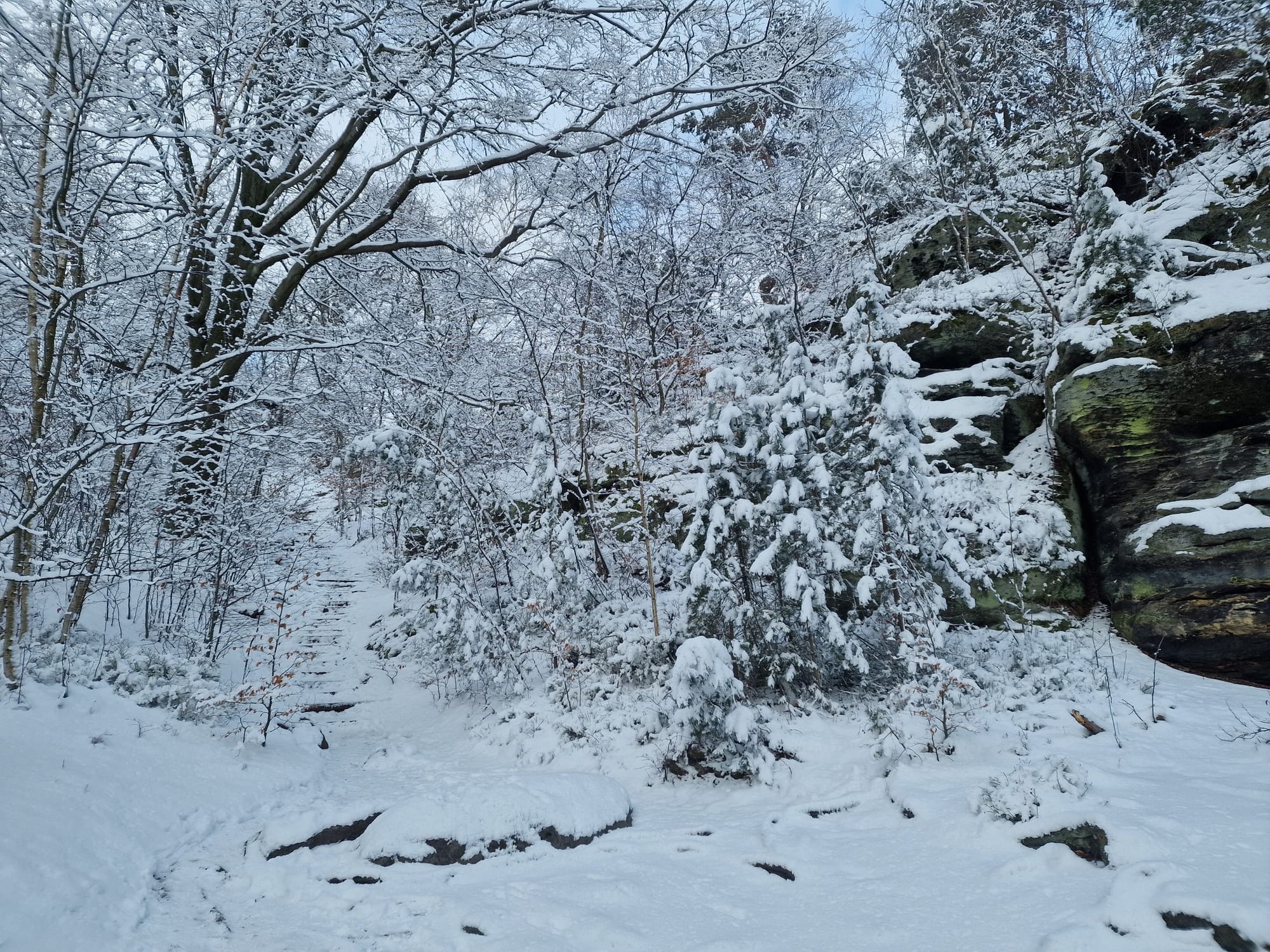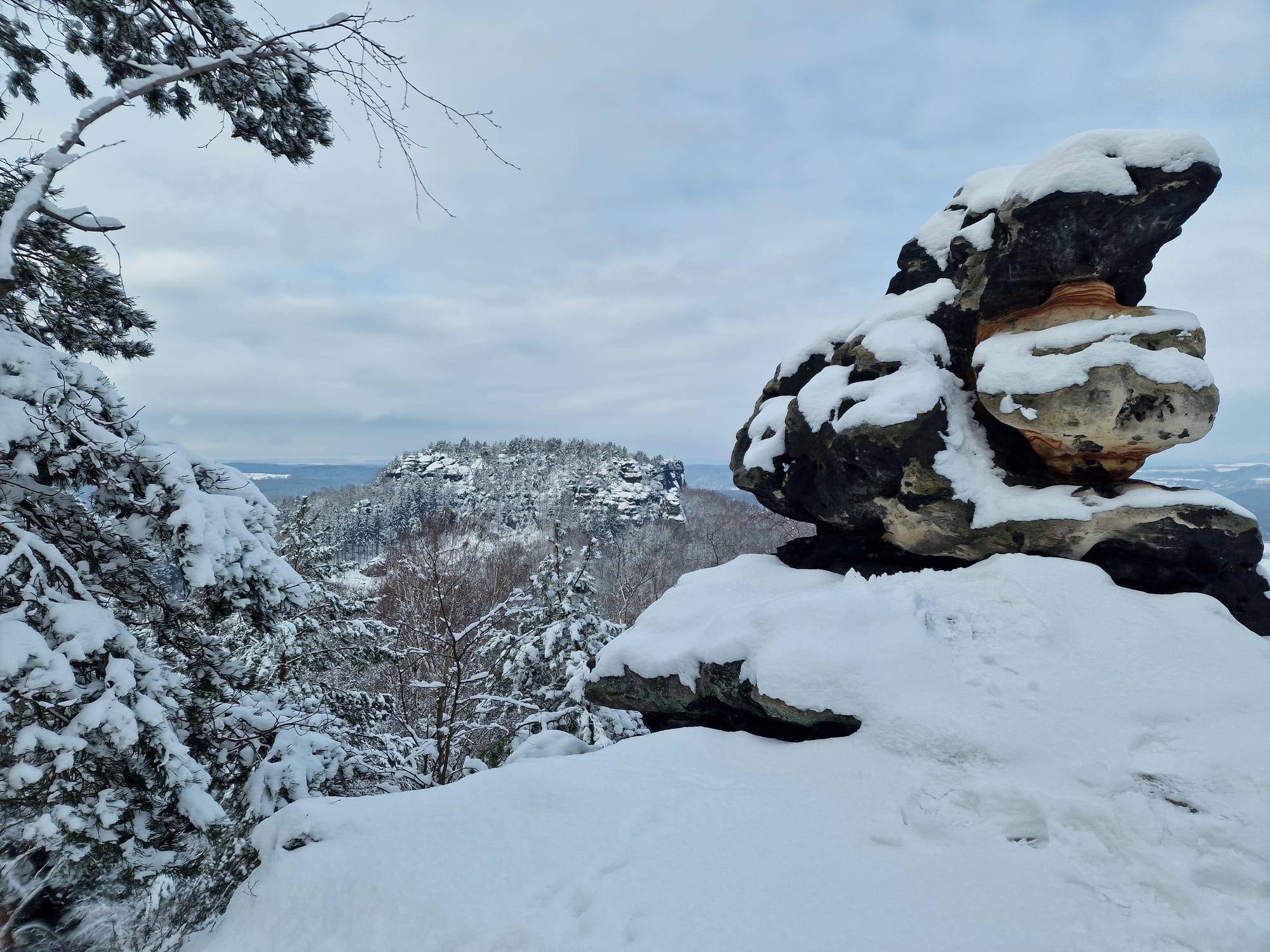 Vom Papststein stieg ich darauf erneut hinab und auf der anderen Seite wieder auf den Ghorisch. Trotz Schnee wählte ich wieder die Falkenschlucht, mein bevorzugter Weg für den Aufstieg. Vom Ghorisch selbst stieg ich danach wieder hinab zum Auto und beendete die kleine Runde auf meine Lieblingssteine im Winter.
